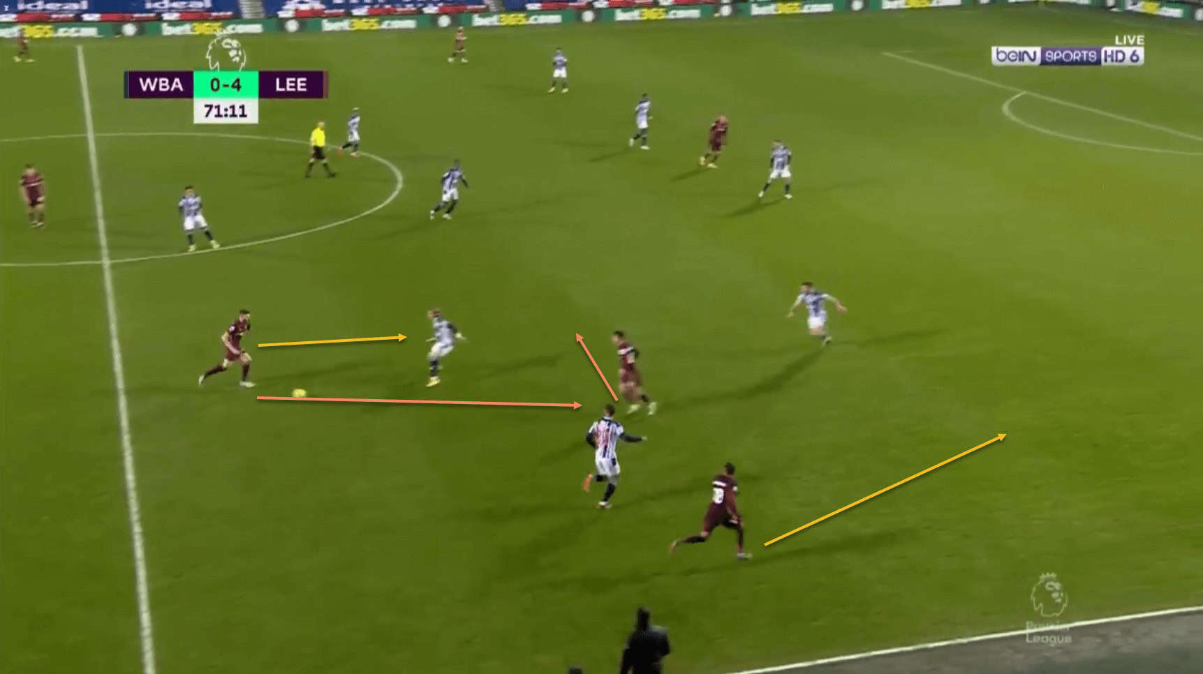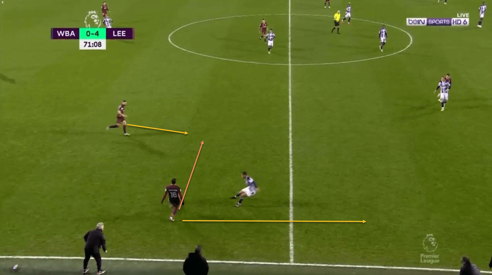 Another example, this time off the left flank. Raphinha has two simple passing options available to him – Dallas is maintaining width on the touchline ahead of him, while Pablo Hernandez is offering an option inside as well. However, the winger notices that Bamford has been able to drift into space on the edge of the box, and he therefore passes into space for the striker to receive.