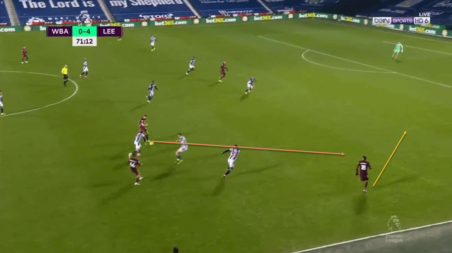Another example, this time against Manchester United, showing how Raphinha holds width which creates the space for the ball over the top from Gianni Alioski