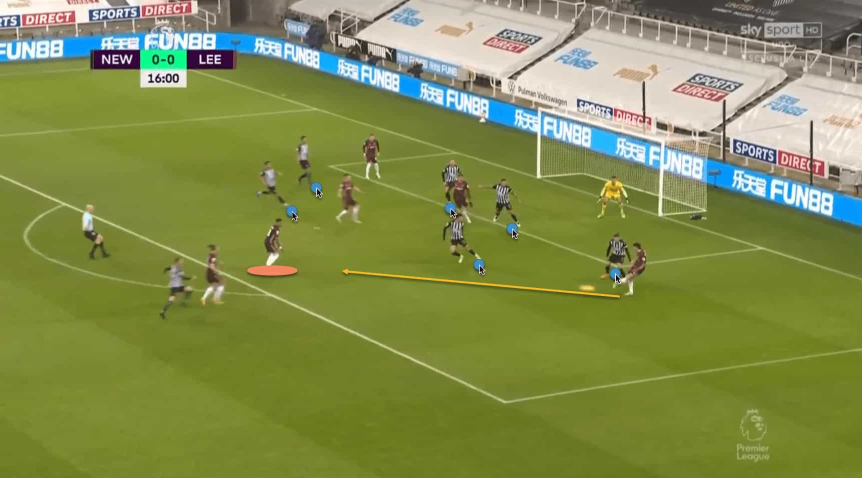 In this example against Newcastle United, Raphinha has cleverly hung back at the top of the penalty area during a Leeds counter-attack, thus finding space in a dangerous area and allowing Rodrigo to pass to him.