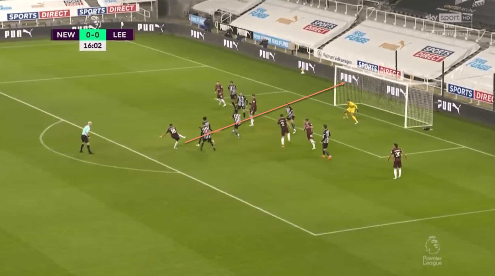 This means that he has the time to take a touch and place an accurate and powerful shot into the top corner, with the Newcastle players unable to get close enough to close him down.