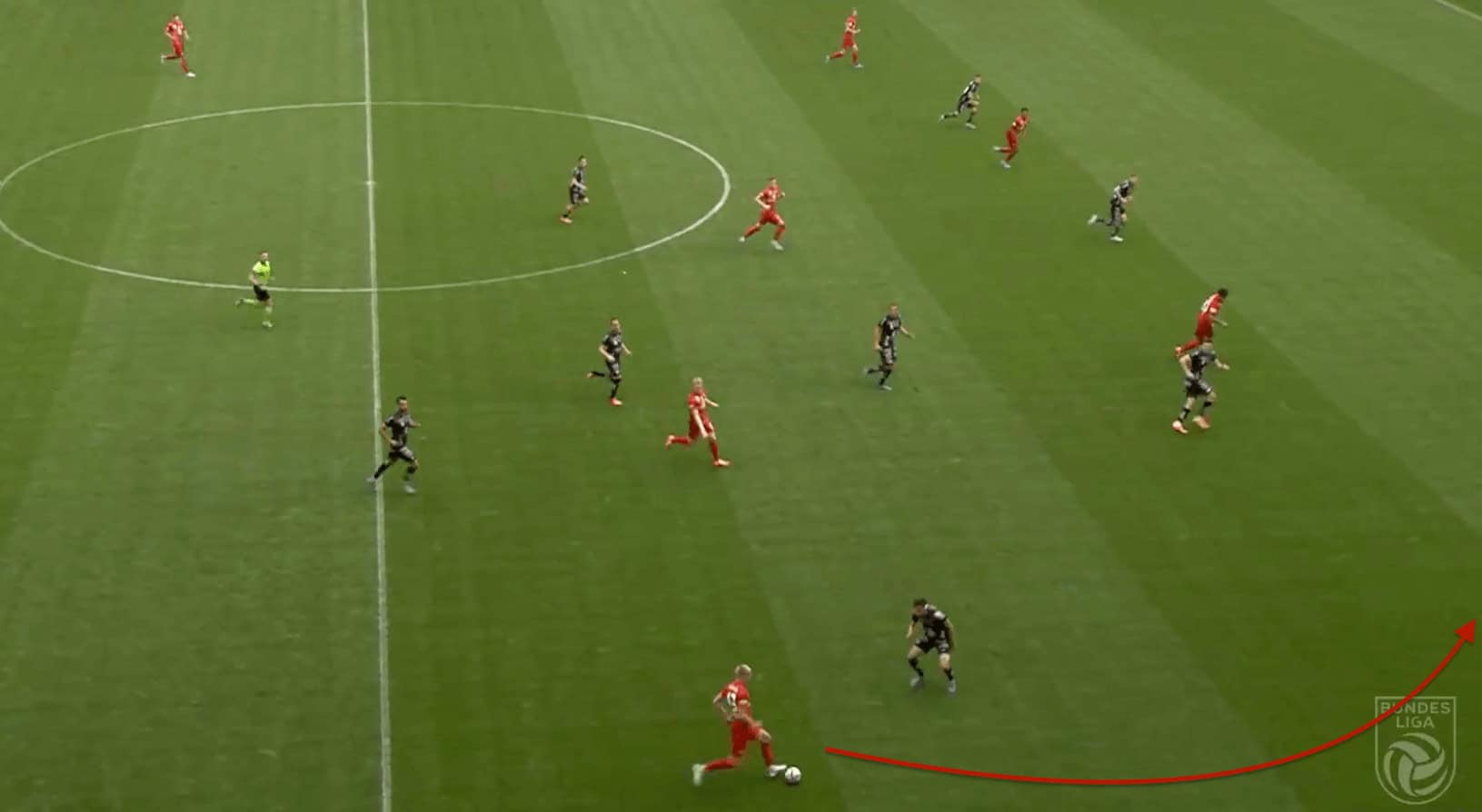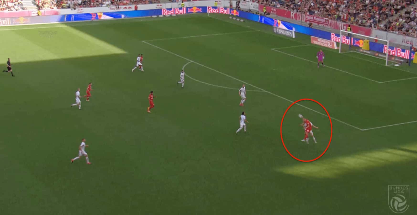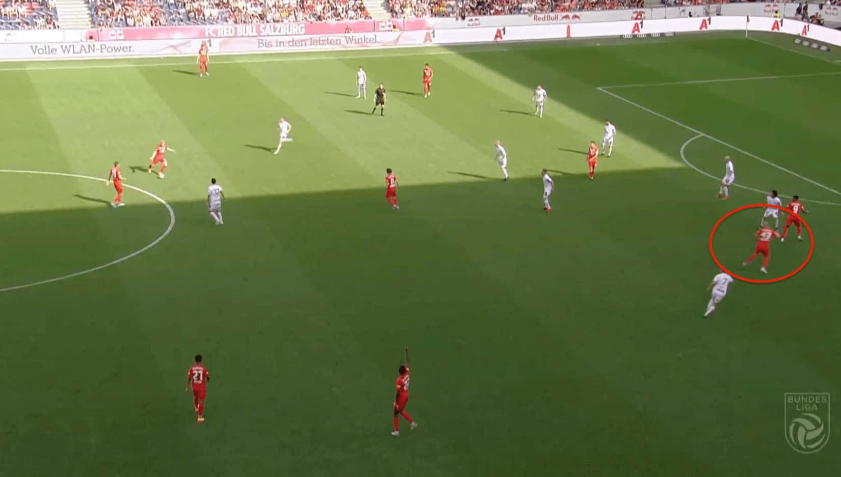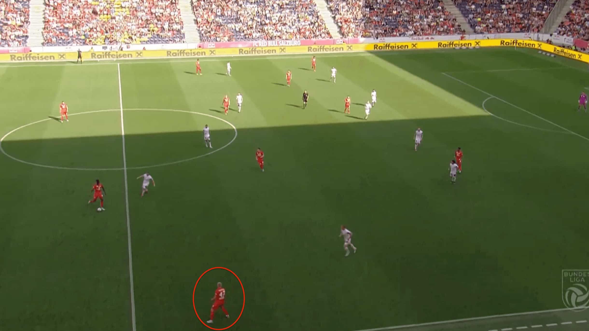 In their system, the central midfielders are pretty much positioned to narrow and are mostly involved to deal with the situations happening in the interior. So mostly the forwards are the ones who interchange a lot with the full-backs by making decoy runs to drag players. But Salzburg are also heavily dependent on creating central overloads and they attack entirely through the centre by creating numerical superiorities. Even at times, he moves more towards the central zones due to their emphasis on creating central overloads which can be seen in the image below where he moves to central zones from the wings.