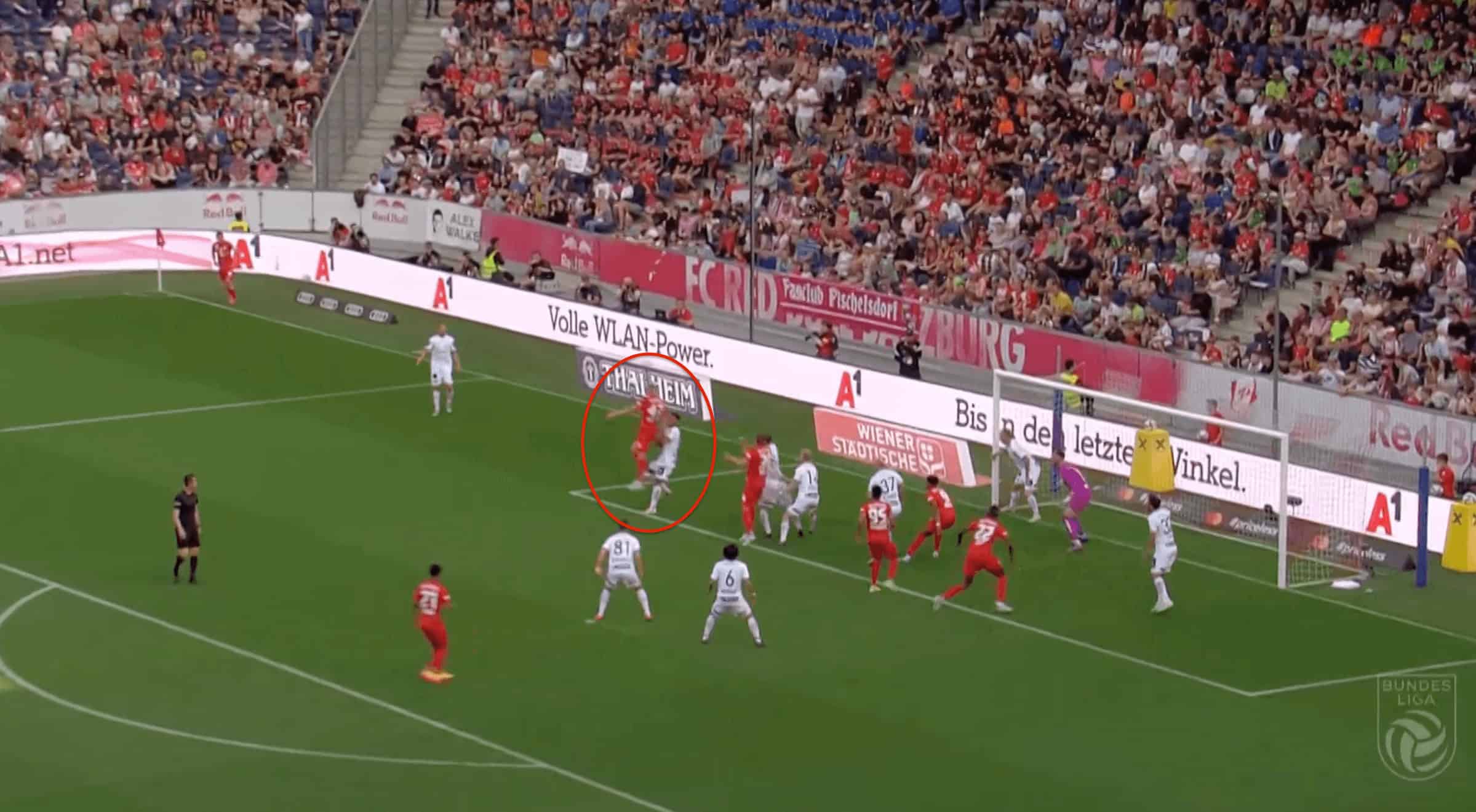 Due to his height, he is very good in the air and Salzburg generally use him as a set-piece threat where he joins the pool of attackers in the opposition’s box during corners where he is also one of the target men there. We can see him in this image below where the ball is being delivered into the box and Kristensen is the one attacking it first.