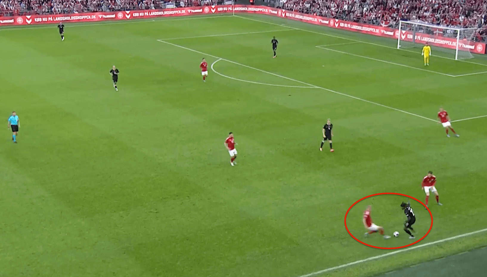 He is also well aware of his defensive positioning and tracks his marker really well even if he is on his blindside. In the above example, he set out to press the Austrian winger but realised that, by the time he went near him, the winger had already rebounded the pass back to his teammate, so he decelerates immediately and then finds the winger making a run forward. He then sprints back with him and also constantly scans him to keep him as well as the ball-carrying player in his eye-sight. Although the ball-holding player has the opportunity to pass it to that winger on the left wing, he cannot do it, as Kristensen is exactly at the right place to go forward and press him and win the ball back.