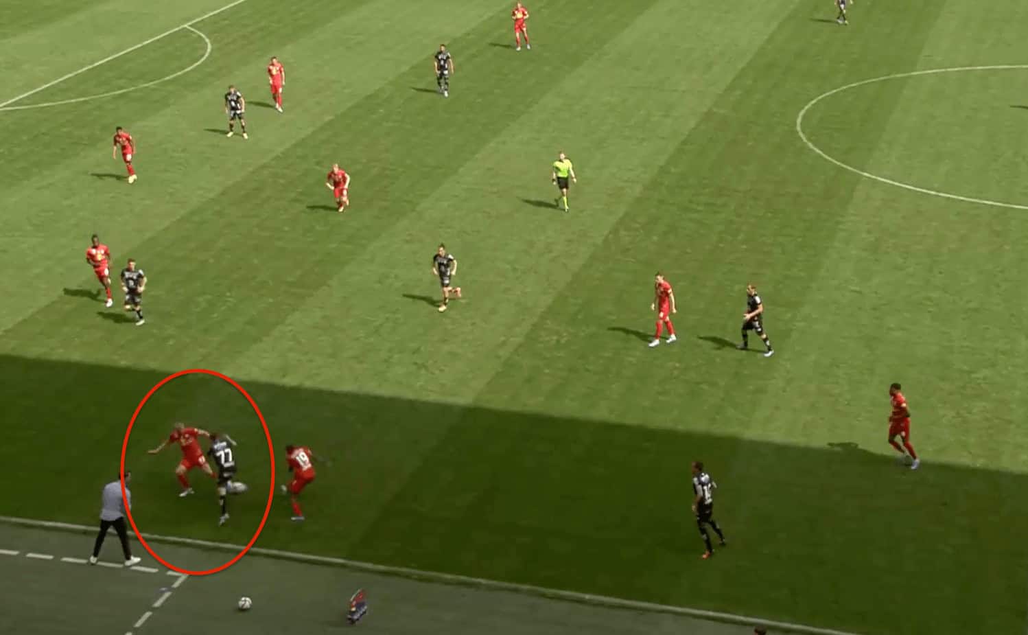 This can be seen in the image above where the opponent tries to beat him on the dribble and go past him. Initially, Kristensen came out to press him but found out that the opposite player is looking to go past him so he adjusted his balance and used his long strides to intercept the ball and win it from the opposition.