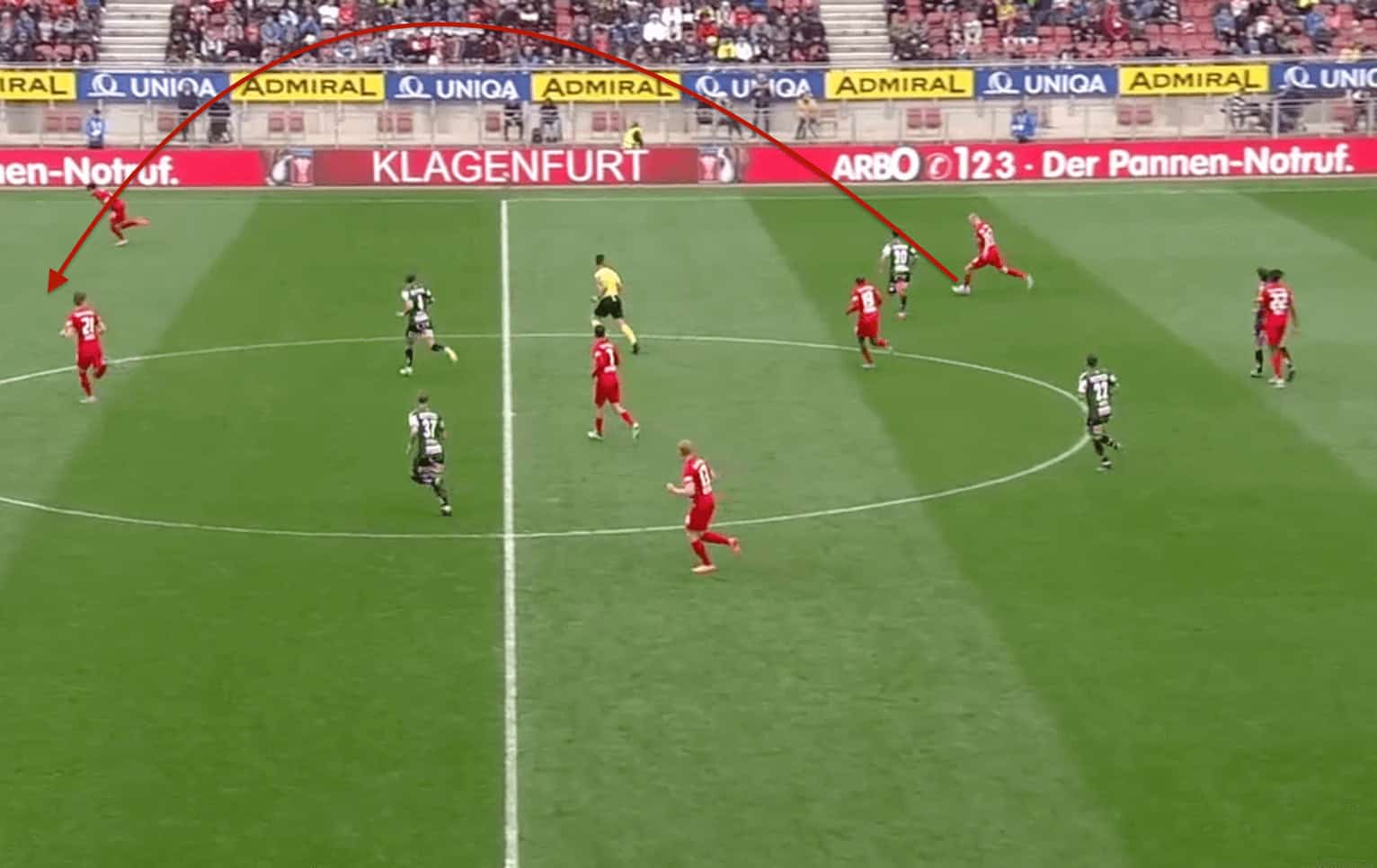 Although he is very good in terms of switching the ball to the opposite flank. We can see an example of this in the image above where he switches the ball to the other side where Salzburg has a 2v1 advantage on the opposition’s right-back. But the issue with this pass was the high loft on it that makes it very difficult for his teammates to quickly receive it as the opposition right-back was able to regroup and intercept.