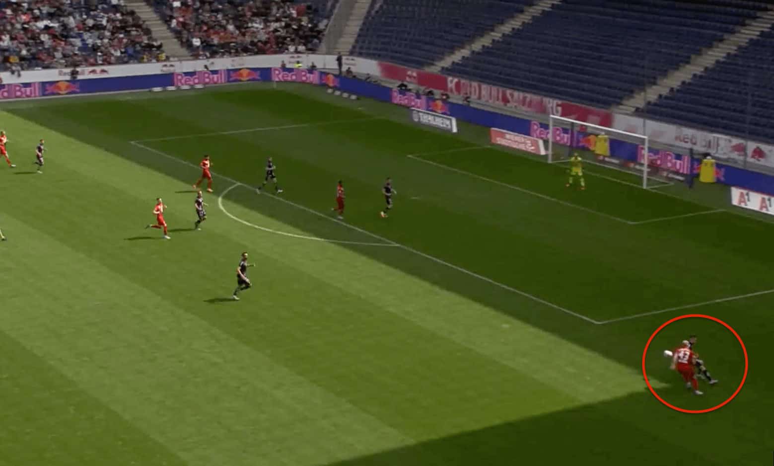 In the example above we can see him dropping deep to receive the ball and we can also see there is not a single player other than him on the wing where the entire Salzburg setup is aimed at being narrow and prioritising central overloads. He also has a good sense as to when to create separation from his markers and receive the ball from his teammates.