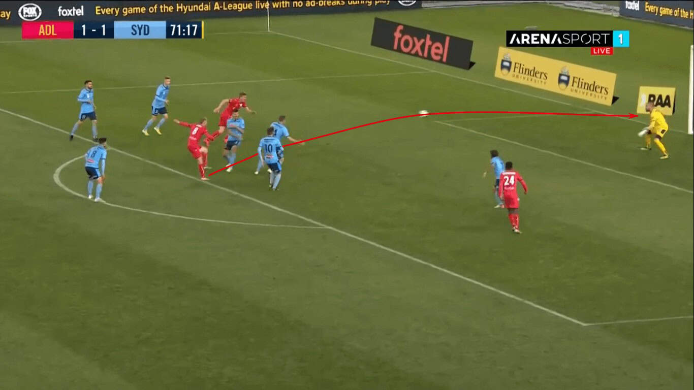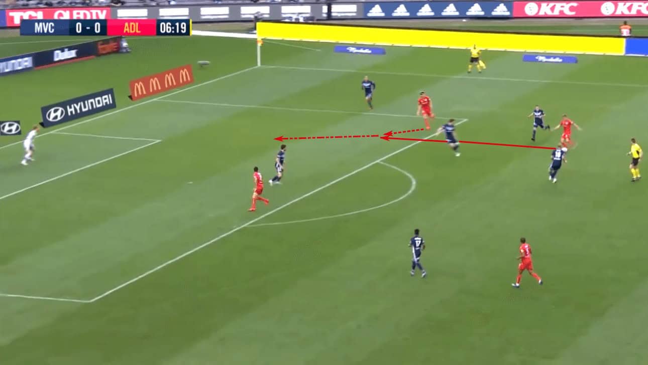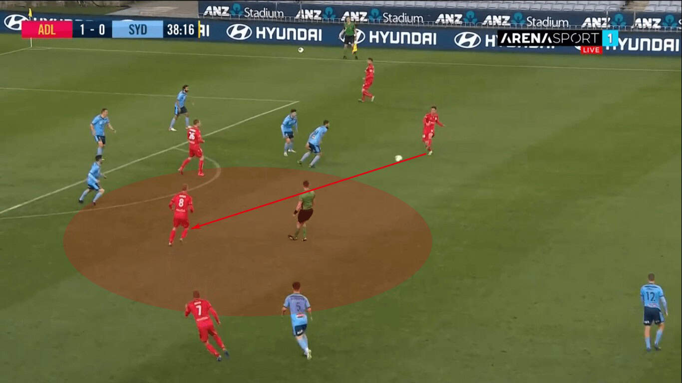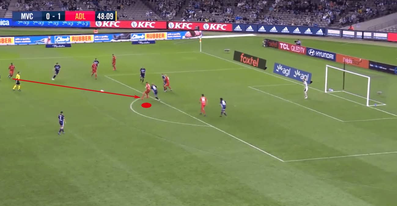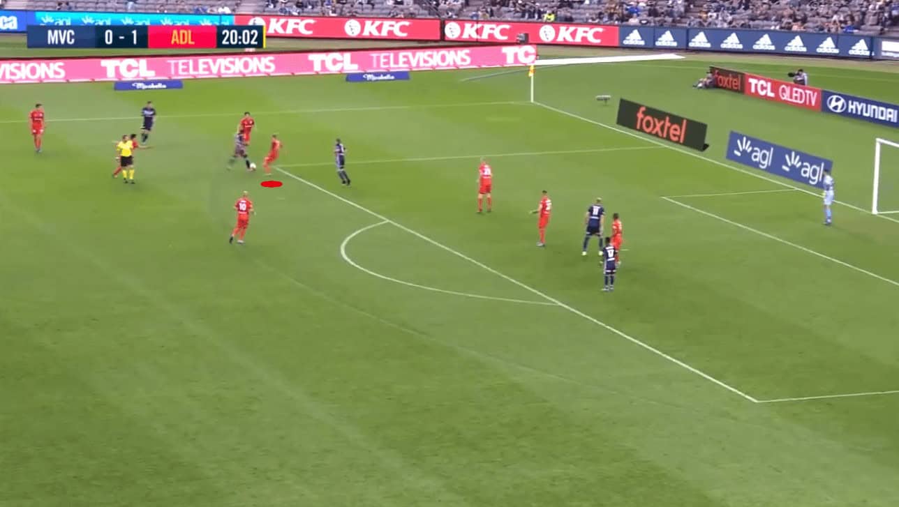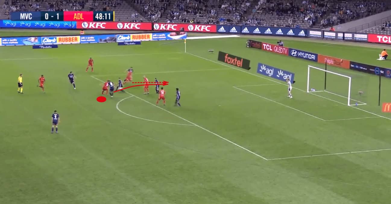 The image below shows a scenario against Melbourne Victory. Dropping deep to help in defence, McGree decided to engage the attacker in an all-or-nothing duel even though the Adelaide backline wasn’t in position to offer coverage. If you look closely, you can see his right leg extended towards the ball with his centre of gravity behind his plant foot, leaving McGree off balance and unable to adapt to his opponent’s move.