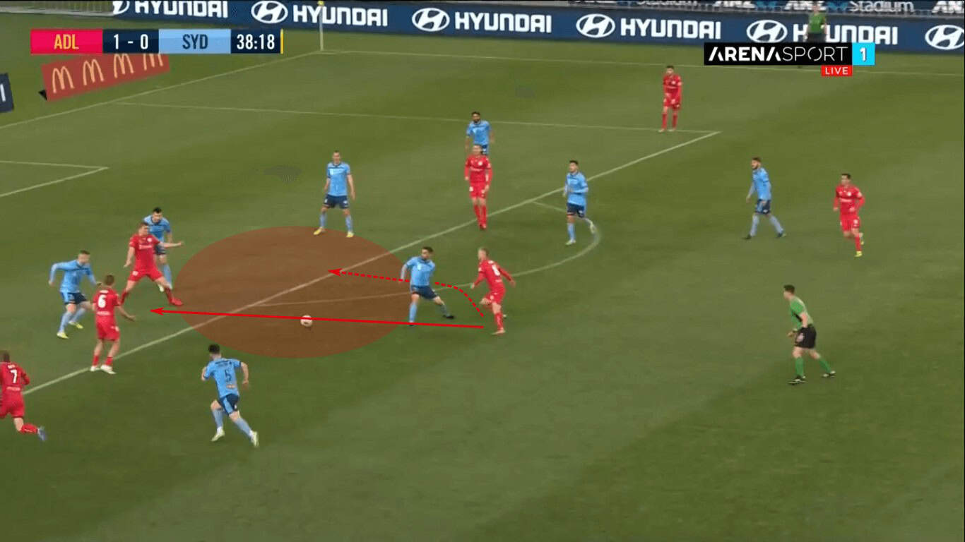You’ll see him work off the centre-forward much like he is the example below. Ben Halloran has rotated into the #9 role and positioned in the middle of a Sydney FC square. Since he’s positioned behind the midfielders, the defenders are aware that they’ll likely have to step to him. That brings an additional problem. With Halloran positioned between the two centre-backs, Ryan McGowan, on the right, can’t step immediately to McGree. That creates a pocket of space for the Adelaide United attacking midfielder.