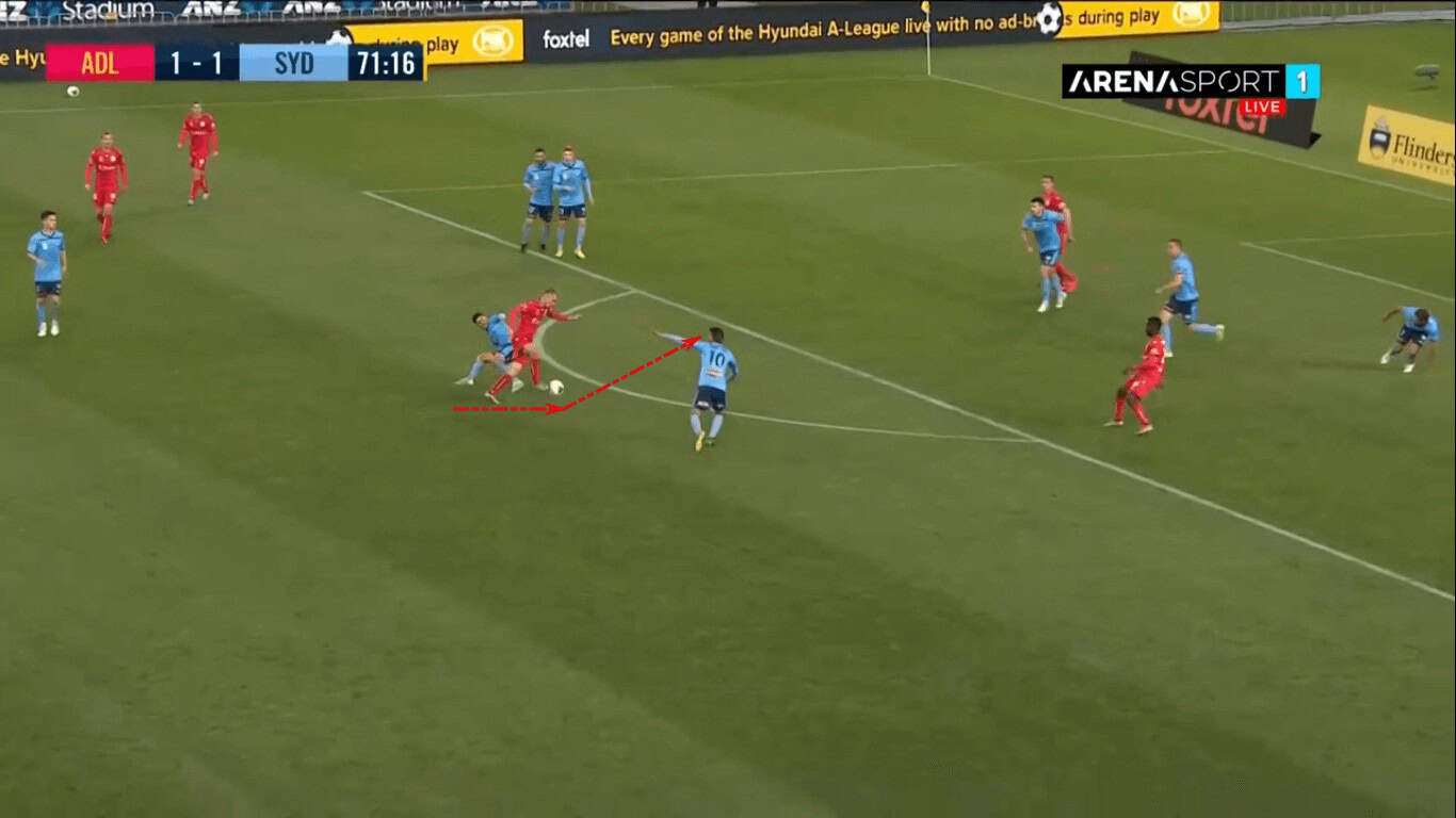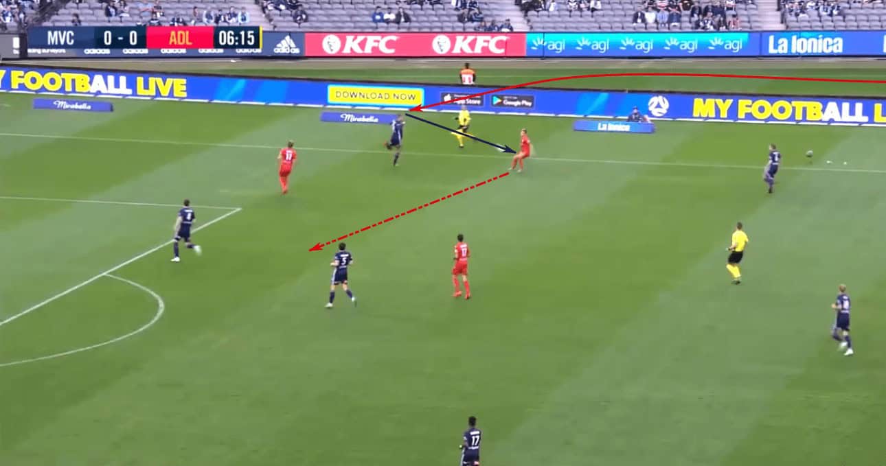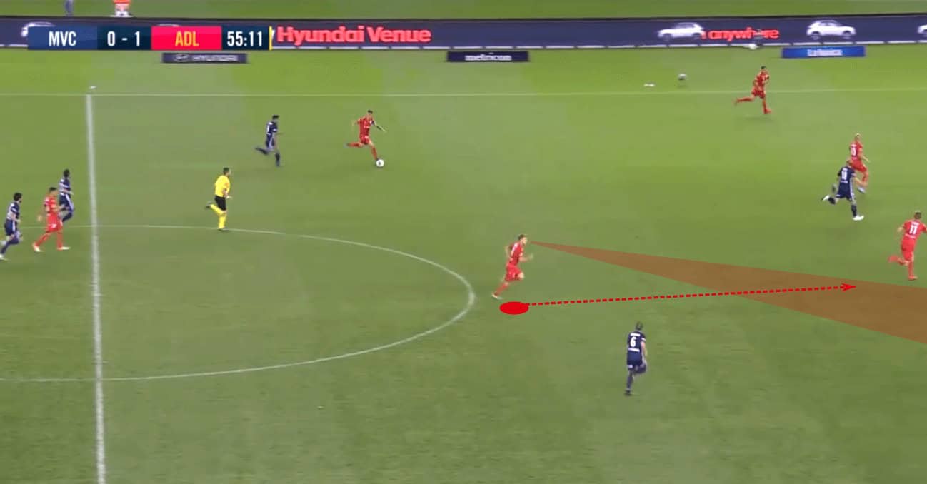 In the image below, his tactical intelligence is once again on display. Likely my favourite sequence from this scout report, we have Adelaide United darting forward on the counterattack. The broken line shows McGree’s running path while the triangle highlight’s where he’s looking.
