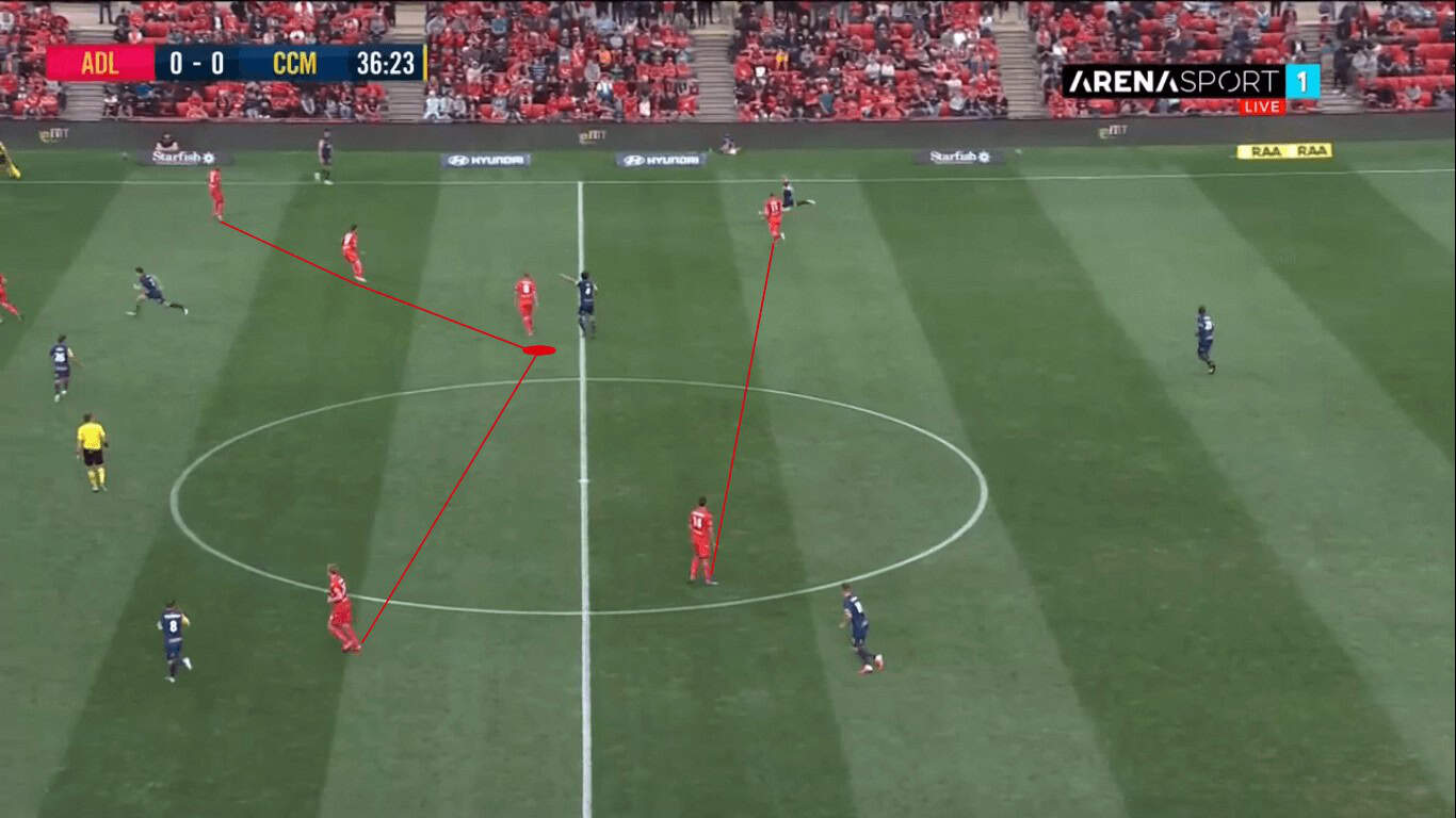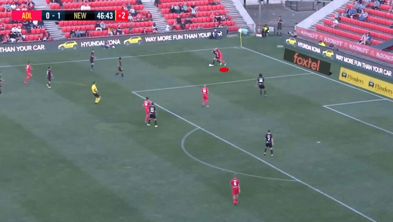 How Charlotte FC and Birmingham City plan to use him remains to be seen. From a defensive standpoint, he’s a willing counterpresser, but he’s also very attentive to the team’s defensive tactics. Adelaide United typically asked him to take away the opponent’s defensive midfielder in the build-up, a task he performed at a reliably high level as his scanning ability allowed him to track his mark well, as seen below with the red circle.
