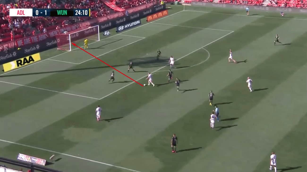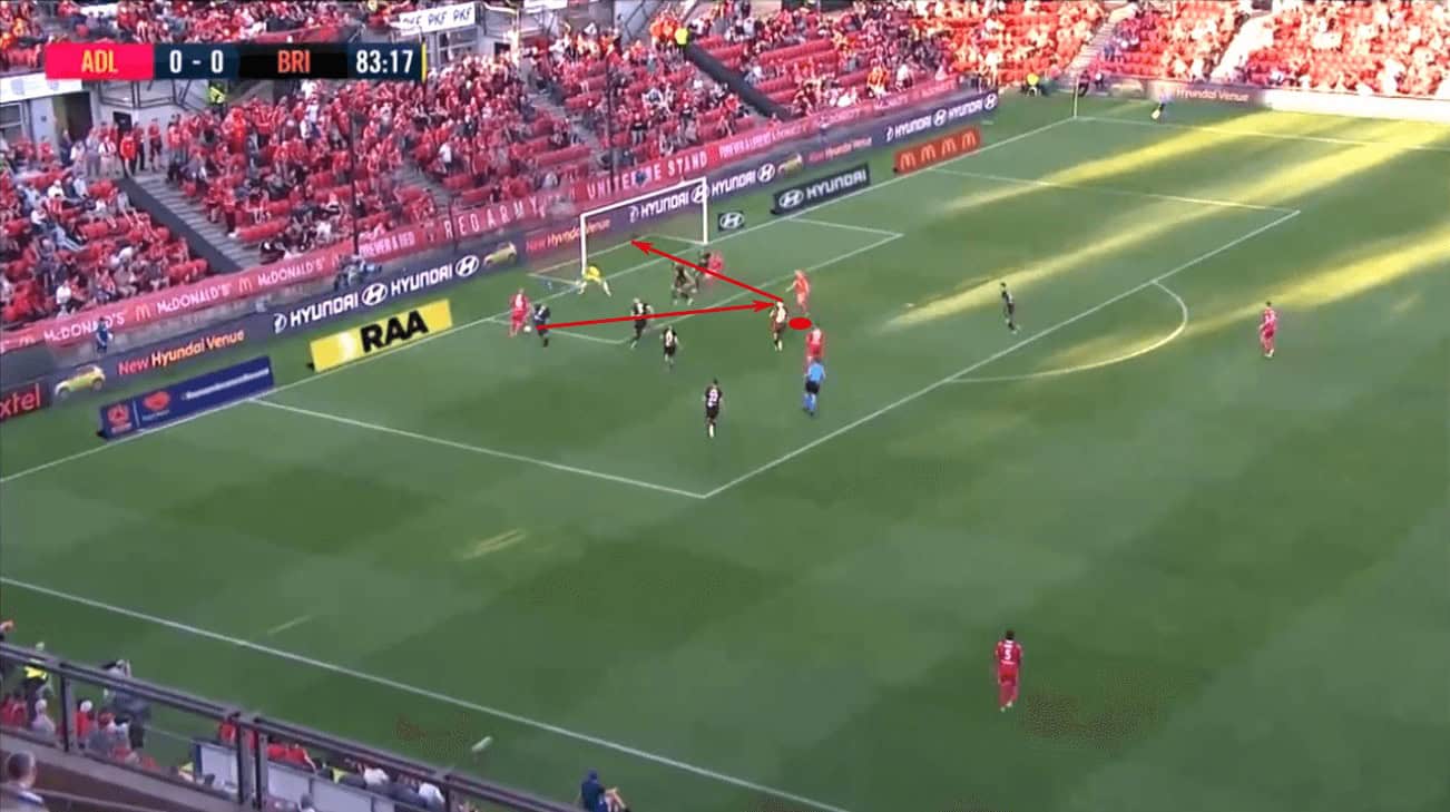 After a number of scans to his left and right, McGree sees the pass headed in his direction. There’s a nice running lane into the heart of the box. Seeing Adelaide’s top goal-scorer running into that lane with the ball en route to him is enough to pinch the defenders centrally. Seeing that he’s earned their commitment, McGree cleverly dummies the pass. The brilliant move sends his teammate, George Blackwood, at the back post. The shot smashes against the post, but it’s the bit of individual brilliance from McGree that stands out.