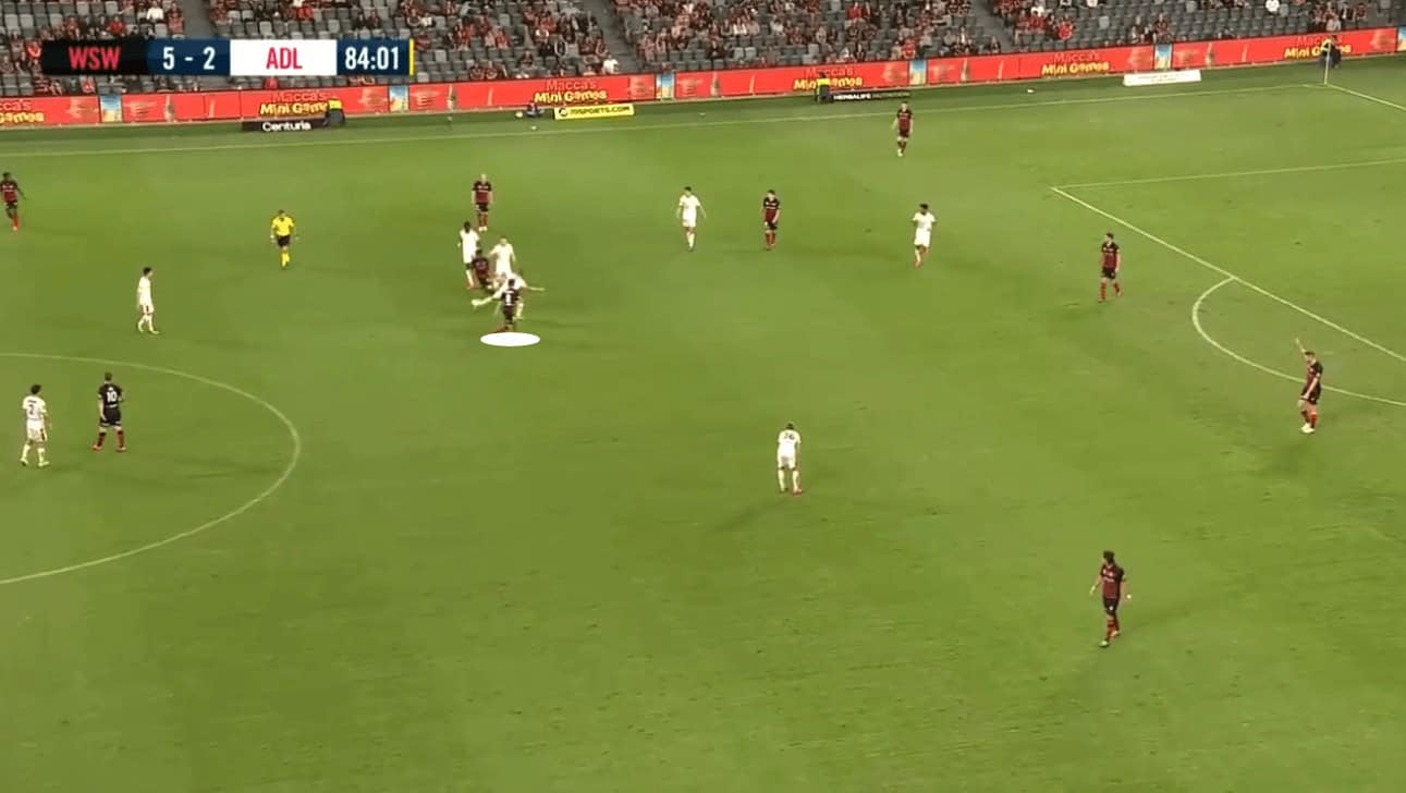 A similar situation occurred against Western Sydney Wanderers FC. Even though two teammates funnelled the opponent into him, McGree gambled on the potential negative pass, leaving him ill-equipped to make the tackle. This time, it’s the left foot far in front while the centre of gravity remains behind his plant foot. The big tactical takeaway in this sequence is that allowing the negative pass is safer than allowing the opponent to break a line on the dribble.