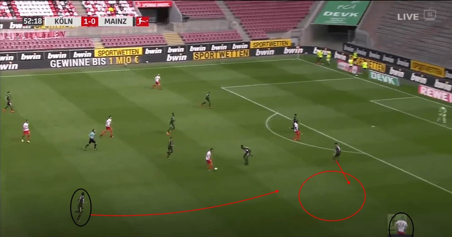 Quaison’s freedom of movement in between the lines when his team are looking to build is one of the key routes which allow Mainz 05 to advance forwards successfully. In the above example against FC Köln, his team are looking to progress the ball forward and Quaison has vacated his left attacking midfielder’s position and entered the central space in between the lines. By performing this movement, he not only provides the player on the ball with a clear passing option to progress the ball forwards, but he also creates space for his teammates to exploit, as we can see above.