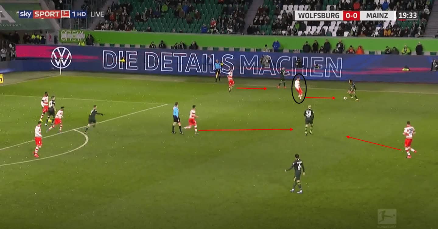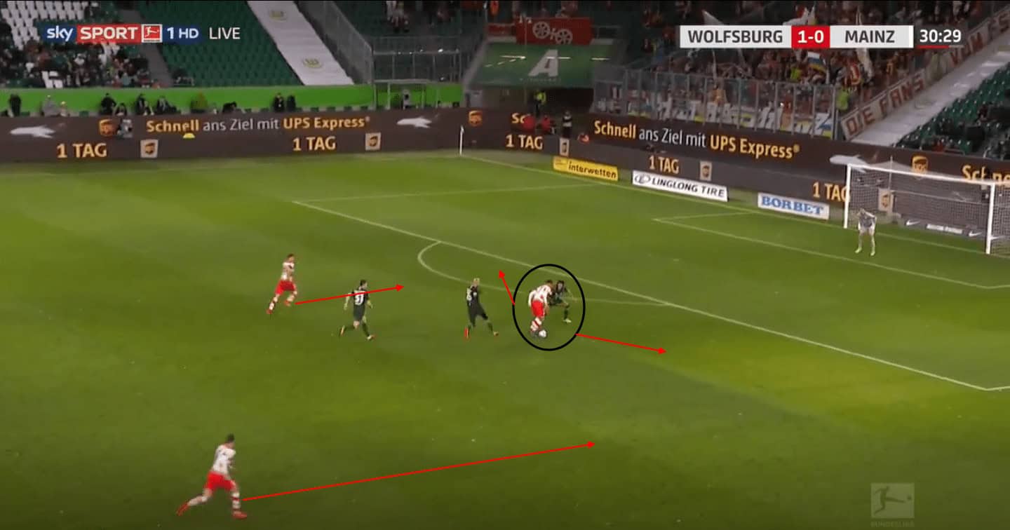 In the image above, Quaison has possession of the ball in a transition defence to attack phase of play. Under pressure from the front as well as the left side, Quaison looks to advance the ball into the Wolfsburg penalty area. His close control under pressure and strength to stay in possession against pressure meant he was able to progress the ball into the path of the oncoming left side progressive player who is making the run forward. This pass from Quaison allowed Mainz 05 to progress into the penalty area and gain a clear goal-scoring opportunity.