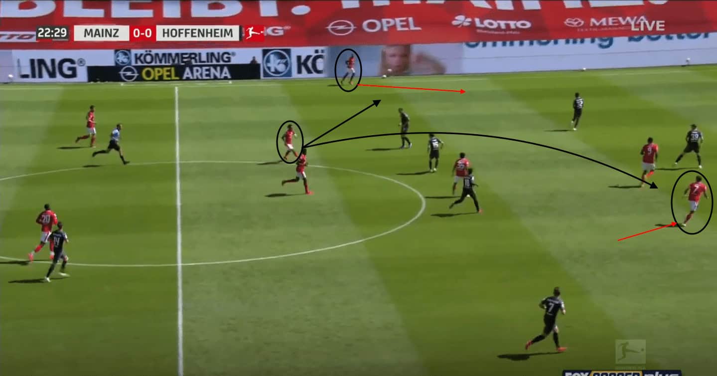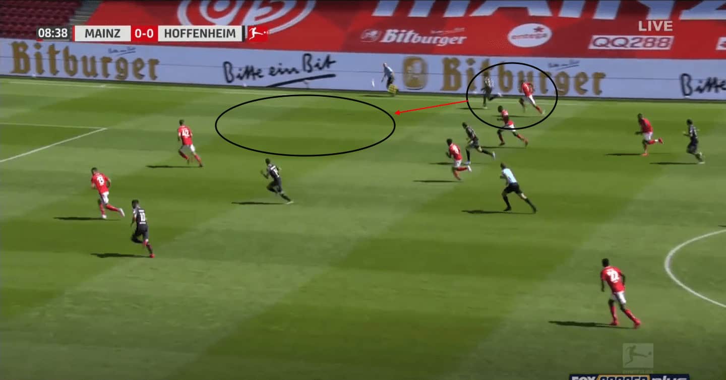 Mainz 05’s main area to progress the ball is through the central areas, and Quaison’s movement allows him to be a huge part of this process which has seen him achieve an xG per 90 of 0.47. In the above scenario, Quaison is once again occupying the central area and looking to make a split run in between the two Hoffenheim central defenders, which provides Mainz 05 with a route into the penalty area. However, what also needs to be noted is that Quaison’s central movement makes Hoffenheim narrow and creates space on the left side for Kunde to exploit.