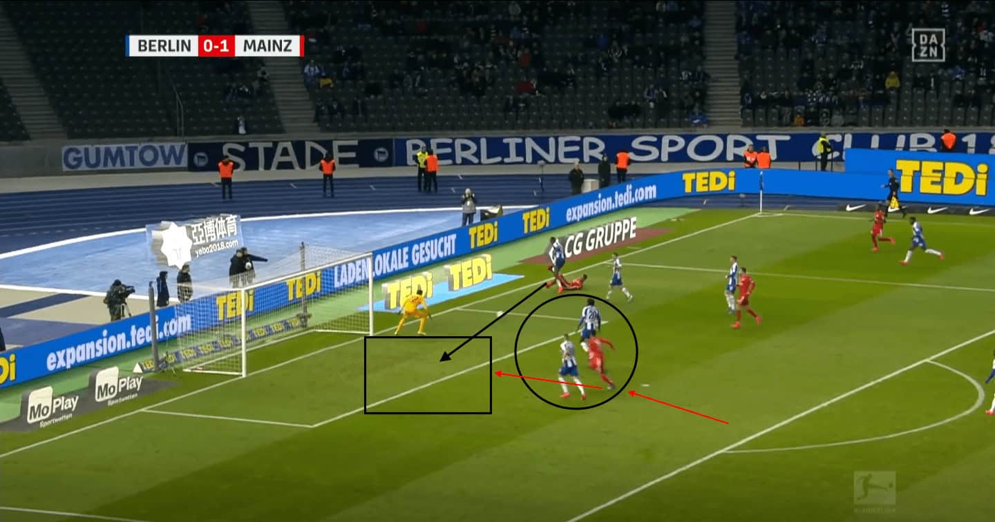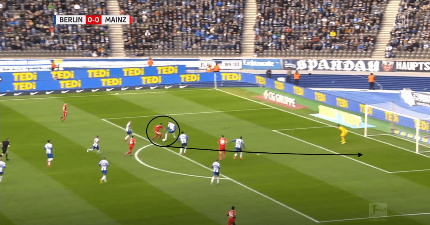Quaison put Mainz 05 in the lead near the 20-minute mark in the game away at Hertha and his brilliance to do so was fascinating to see. He received a pass in the left advanced half-space and carried the ball into the top of the Berlin’s box. His action to manipulate the defender 1 v 1 by performing a fake movement allowed him to create space to shoot. Whilst performing this fake action, he was also aware of the goalkeeper’s position which affected the choice of shot he made. Knowing the goalkeeper was to the far right of the goal, meant he was able to place the ball at the other side, giving Mainz 05 the lead in the game.