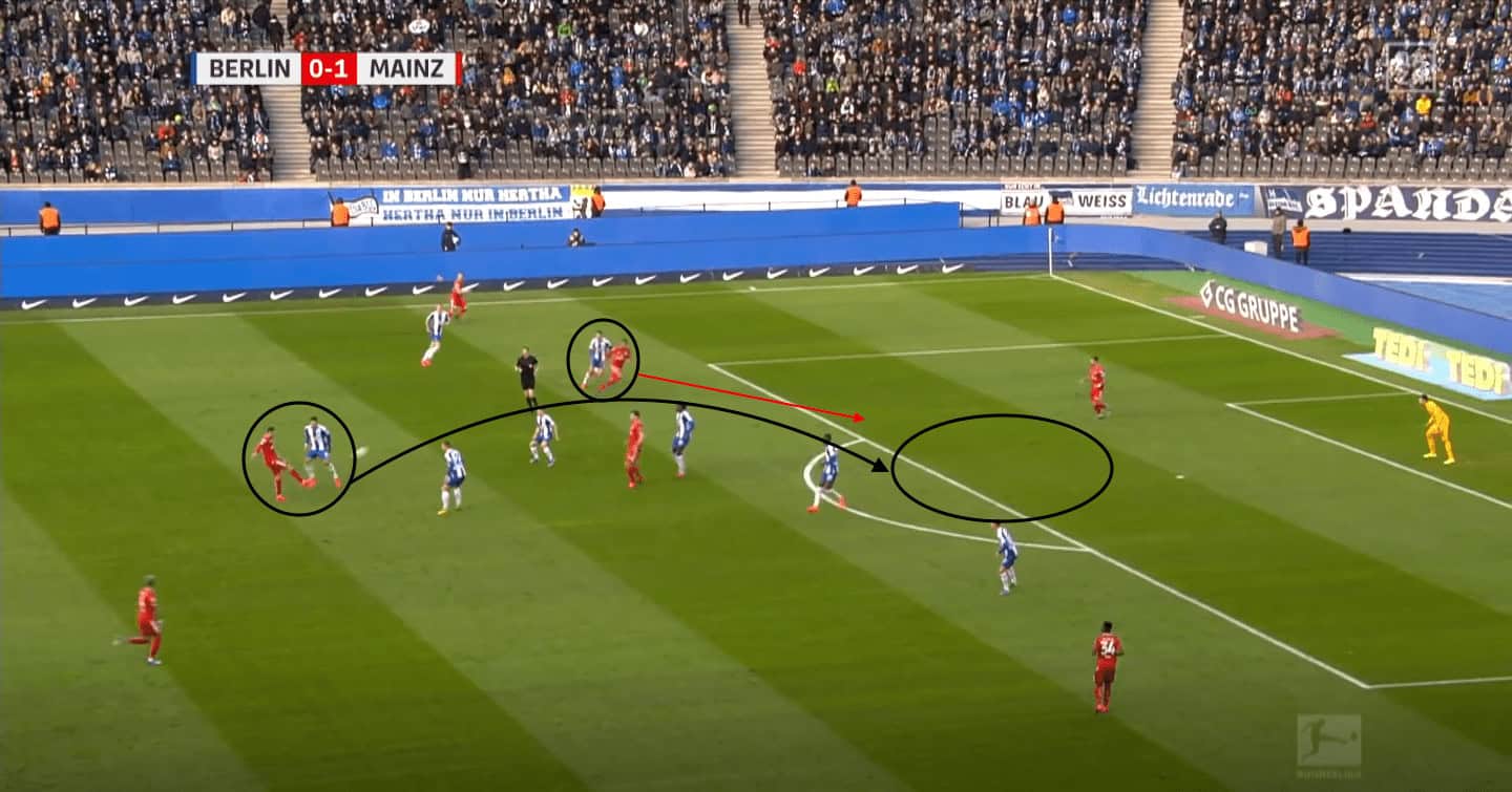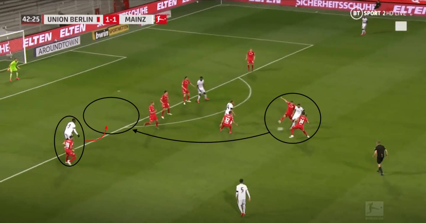 The movement Quaison makes means the opposition defender is attracted to that movement and allows Mainz 05’s left full-back, Aarón Martín, to make a progressive run off the ball, as well as allowing Jean-Paul Boëtius to check his run into this vacated space.