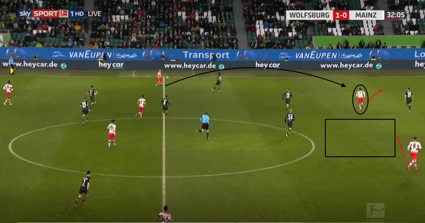 As well as occupying the central space with his movement, Quaison also makes use of the half-spaces which engages the Wolfsburg defenders and creates space in the central areas for other teammates to receive. As we see in the above example against Wolfsburg, Mainz 05 are looking to progress the ball deeper into the attacking half. Quaison can be seen to start in the half-space and make a forward run which engages and takes away the defenders. The run not only provides the player on the ball with an option to play over the top, but also creates space in the central area for Boëtius to receive in between the lines. Quaison’s timing of the run to engage defenders to create space is very effective in allowing his side to exploit the advanced areas.
