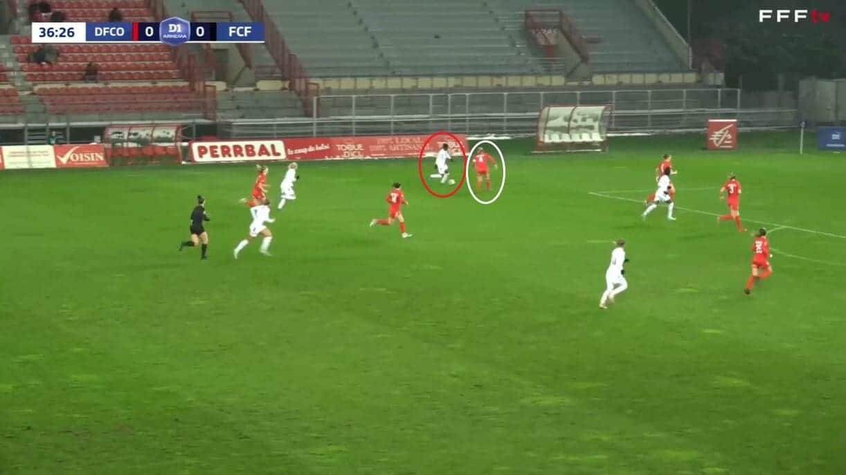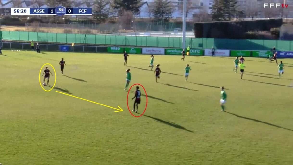 The danger that this provides is shown clearly here as she finds the gap in Dijon’s back line as they attempt to recover from the attacking corner and allows her team to send the ball through the gap before left-back Morgane Martins can get back into position.