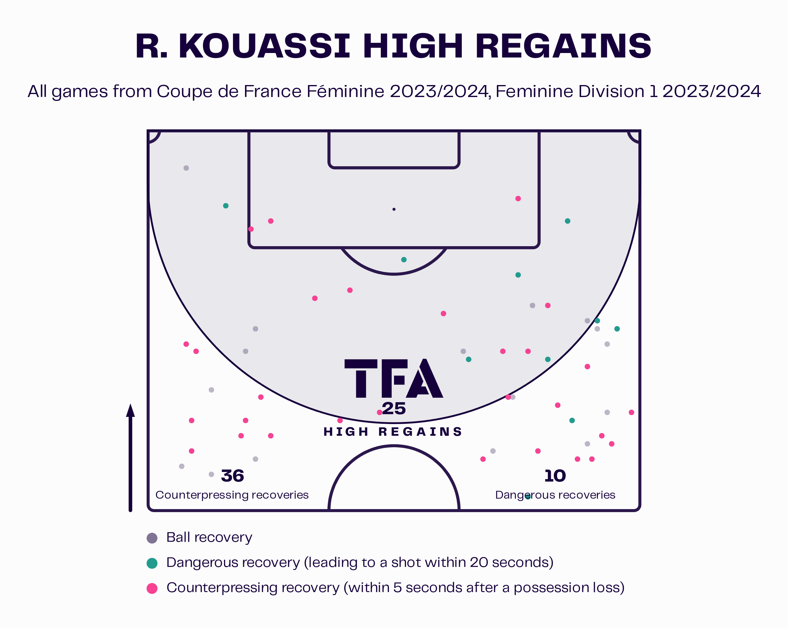Rosemonde Kouassi’s contributions, however, do not only come when her team has the ball, with she also playing a pivotal role in Fleury’s play whenever they are out of possession, and this again highlights the depth of her game and the variety of things that she can offer around the field.