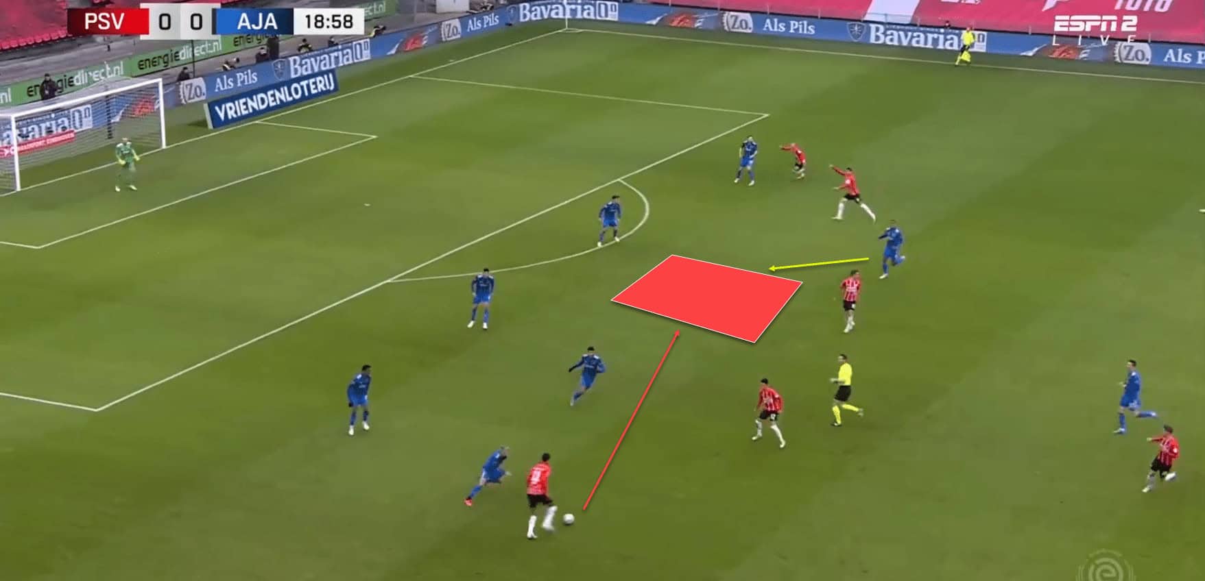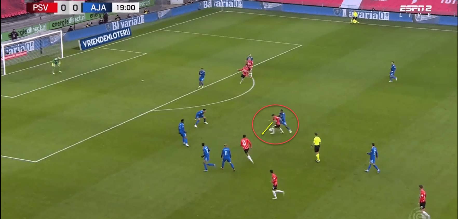 Below shows PSV on the attack, Gakpo is going to play a ball into the highlighted space for Götze to receive. Gravenberch identifies this and makes a run to close down the space.