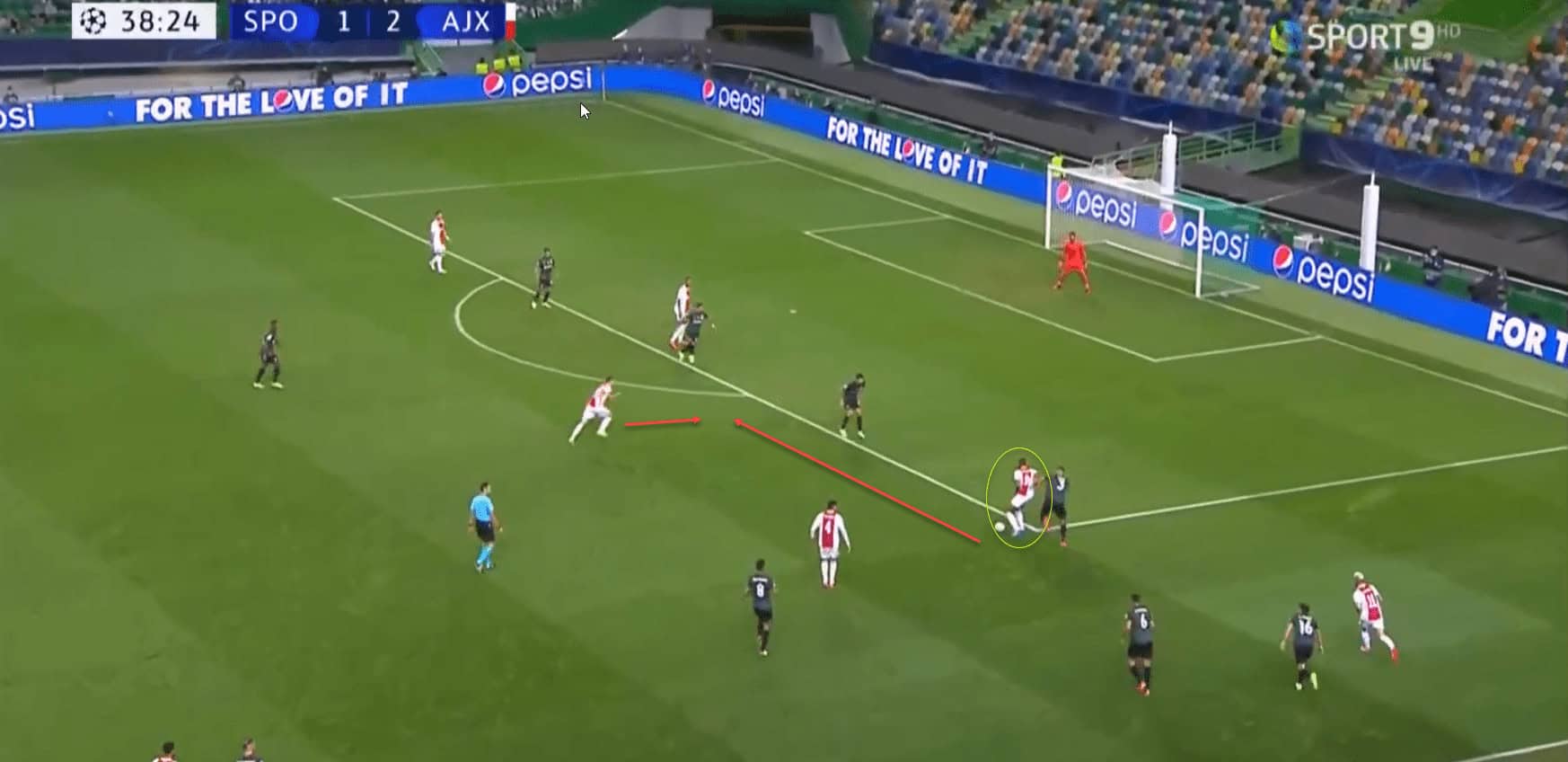 He then opens himself up into the space highlighted and plays a pass to the on running Dusan Tadic. Tadic carries the ball into the box and scores for Ajax in the UEFA Champions League.