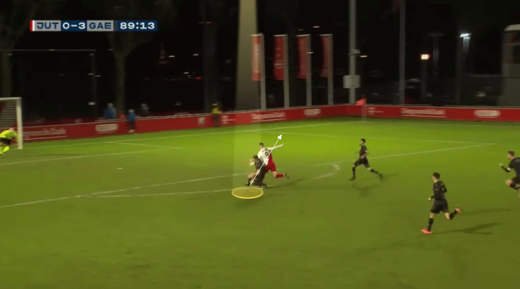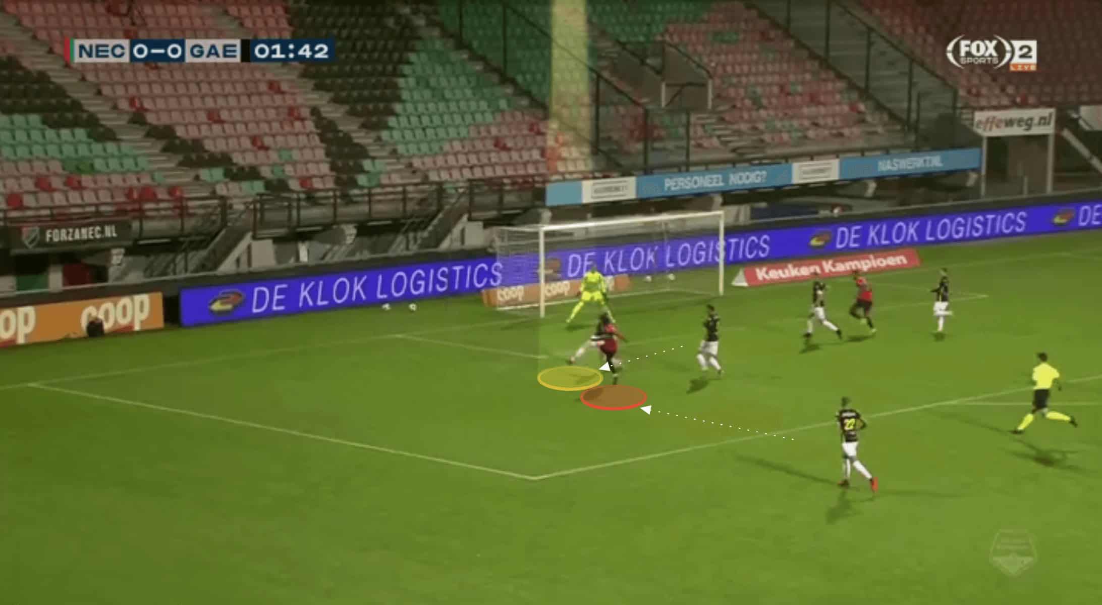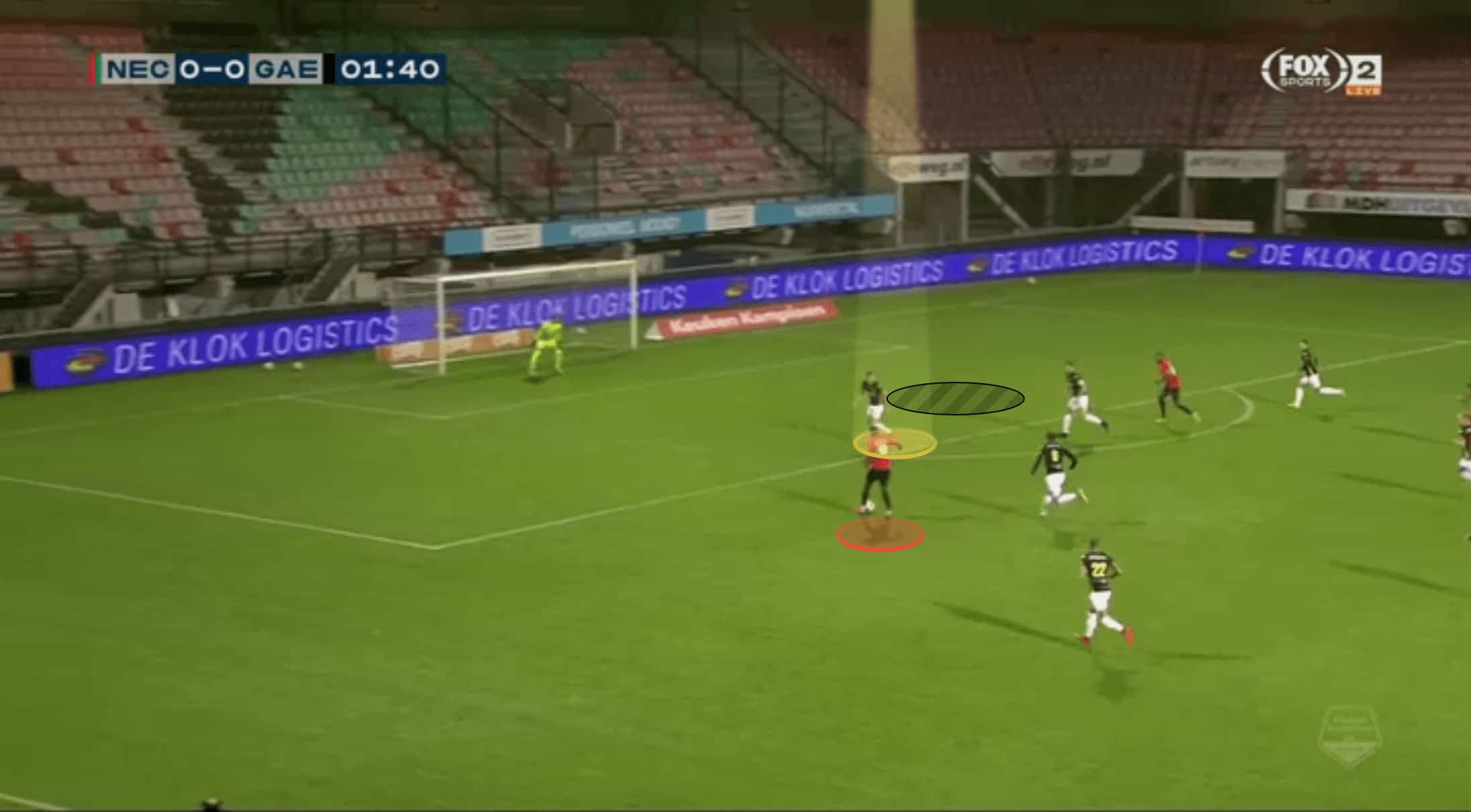 While he gets away with this frequently at Eerste Divisie level, he may need to be slightly more conservative in this area, the higher he plays, and pass opponents on to his midfield in situations such as this.