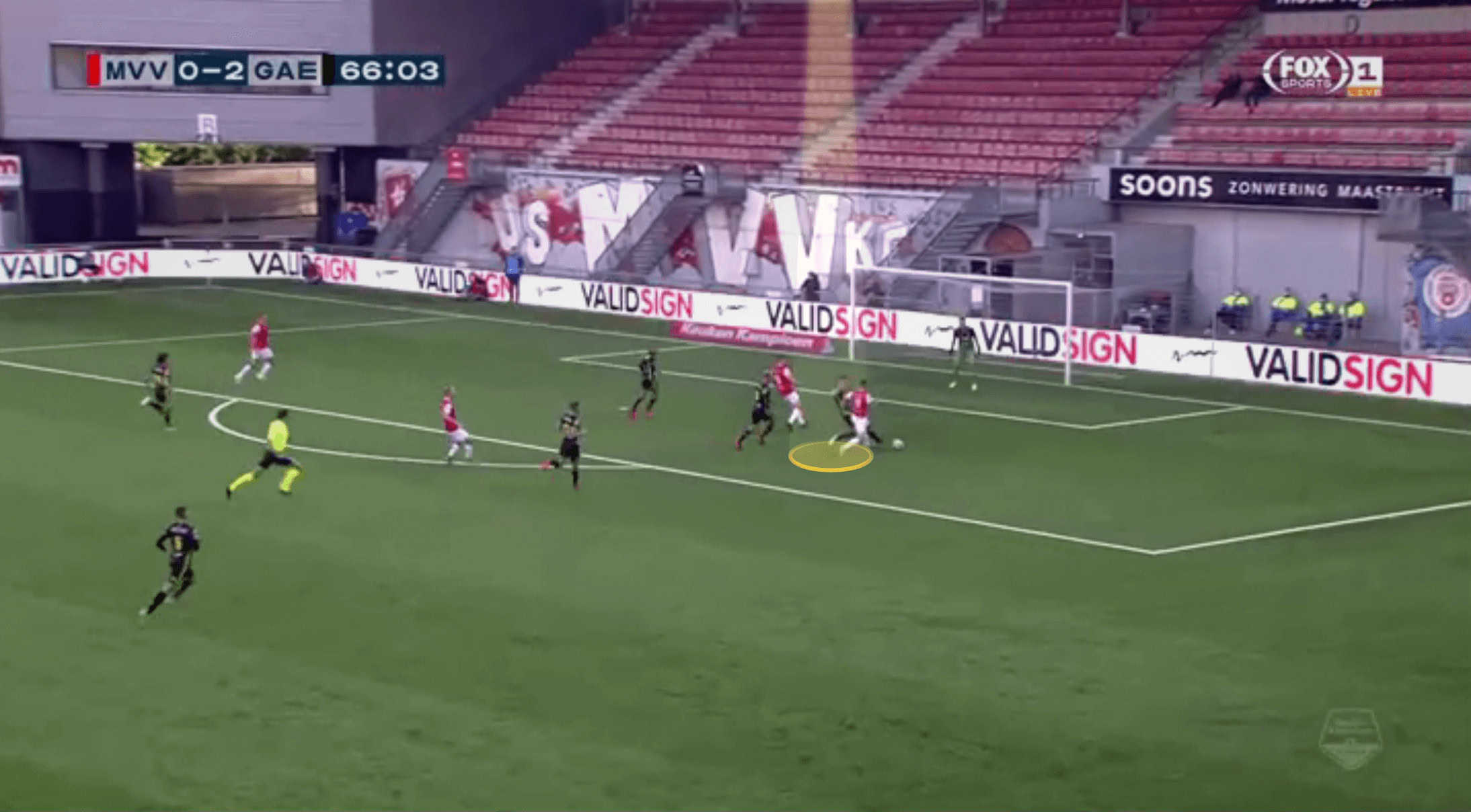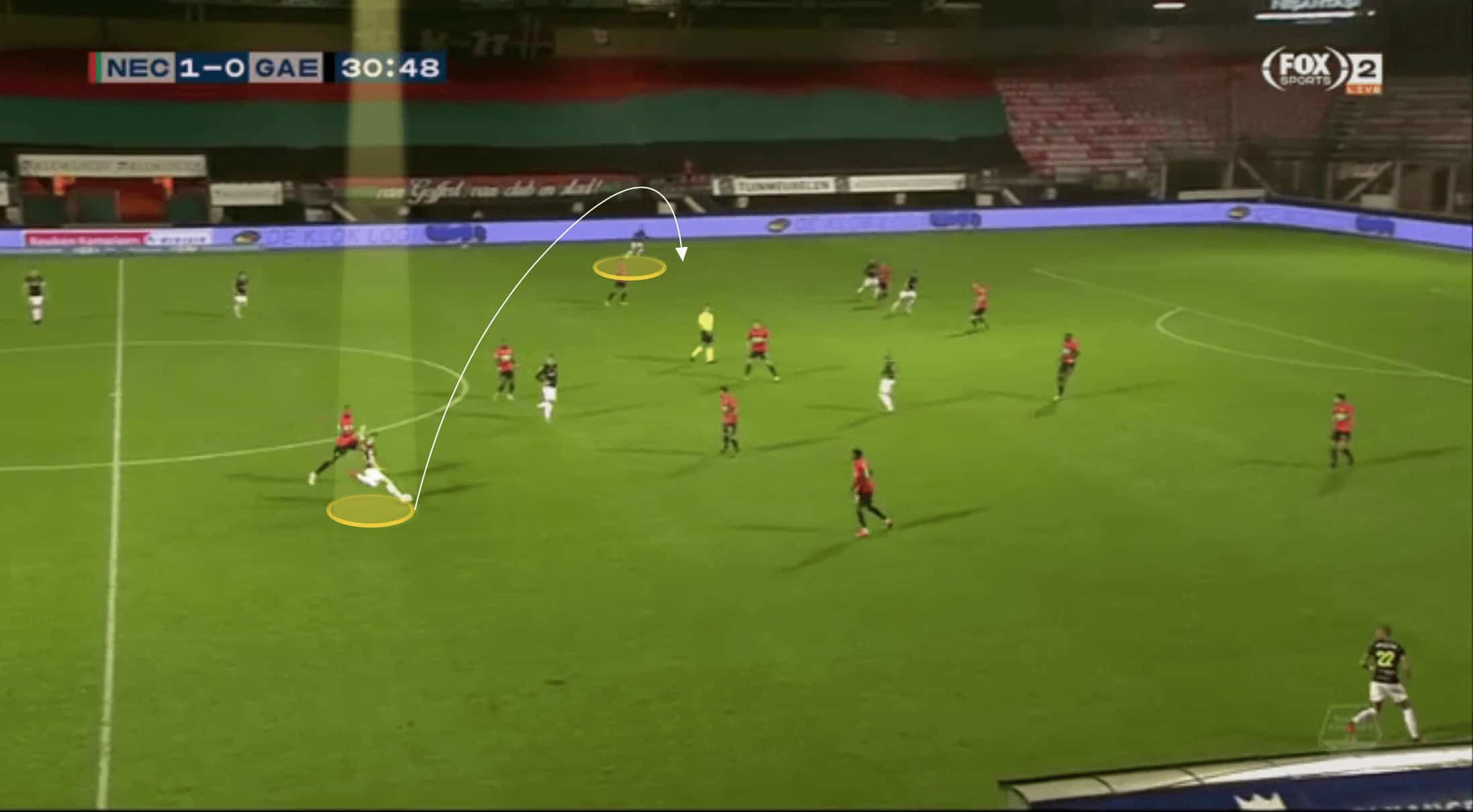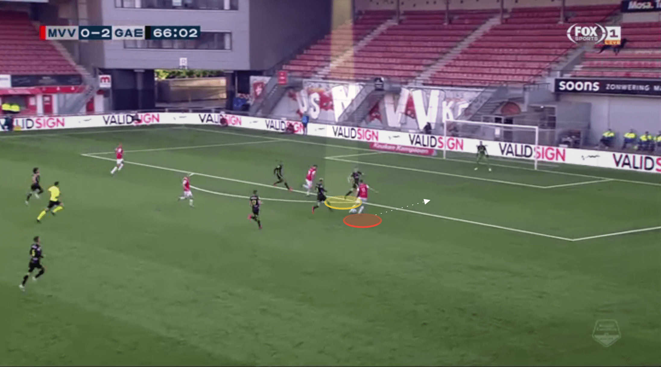 While he gets away with this frequently at Eerste Divisie level, he may need to be slightly more conservative in this area, the higher he plays, and pass opponents on to his midfield in situations such as this.