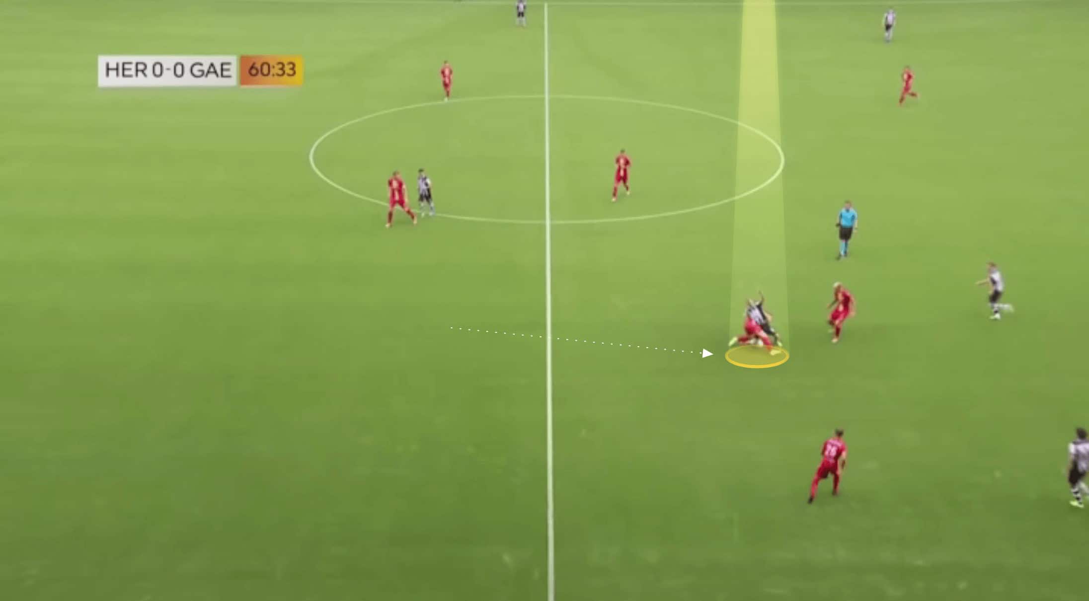 However, he underplays a dangerous lateral pass against this press, and as such gives the ball away in a poor position.