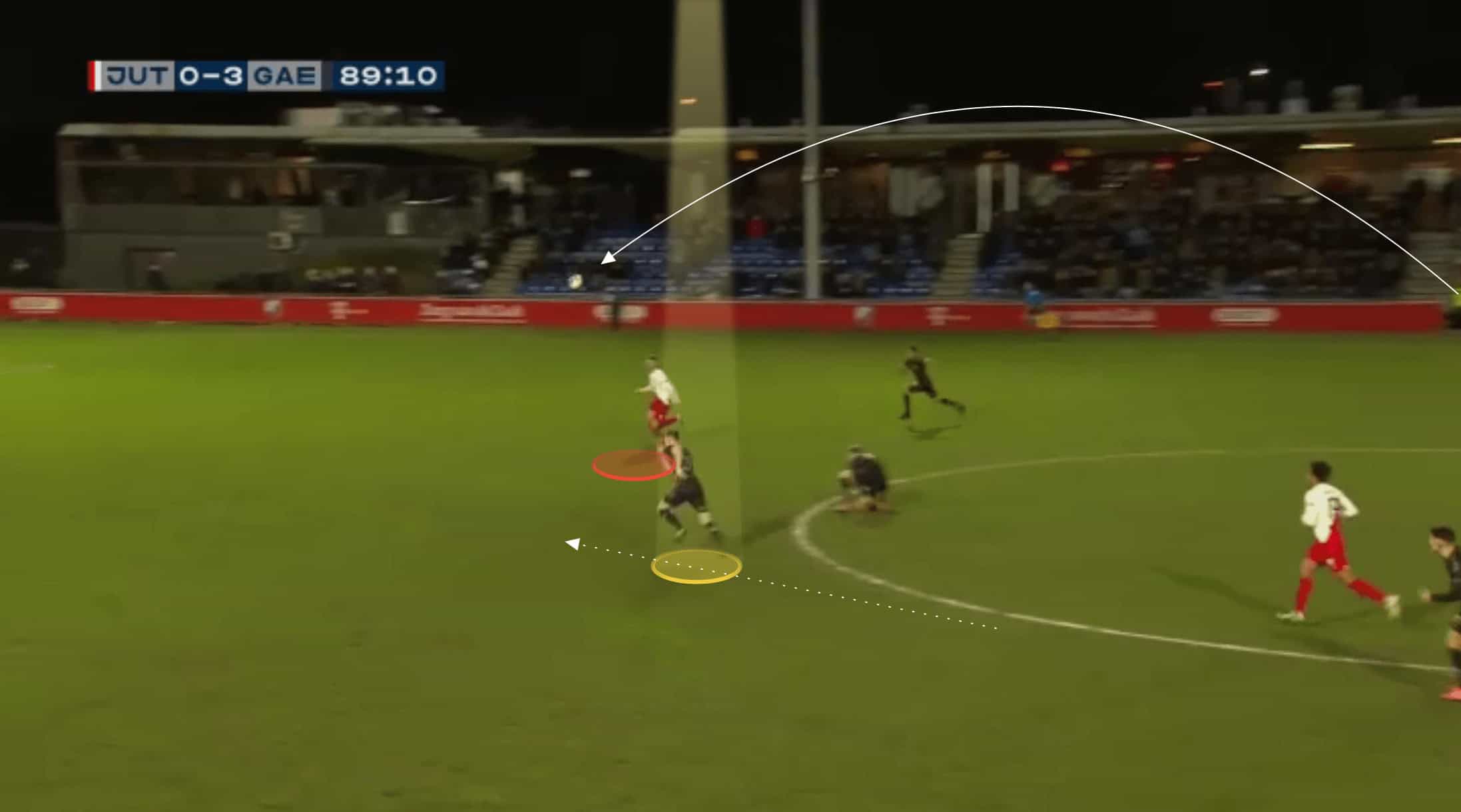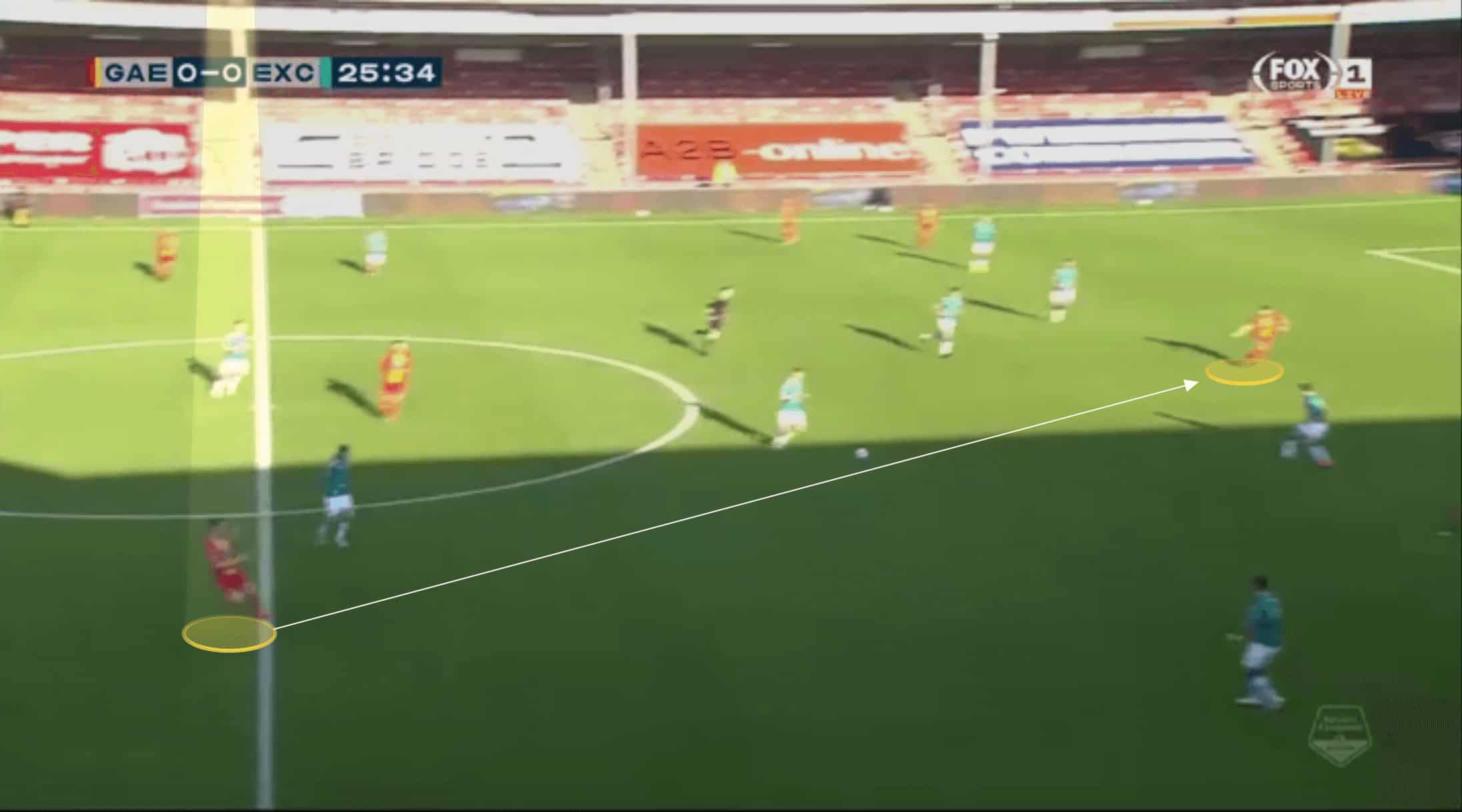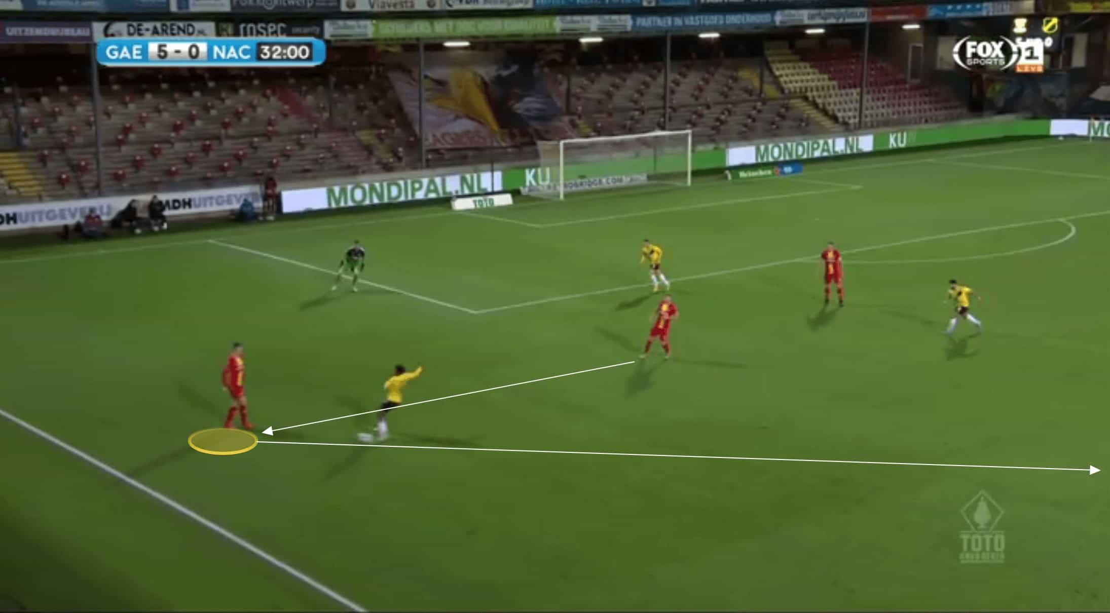 As we can see in the image above, he will take this option on despite there being easier passes on, but he can strike this with such precision that it has the potential to catch a particularly narrow defence off guard or, at the very least, force the defence to quickly switch across as a unit, potentially leaving space between them.