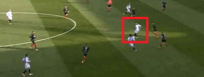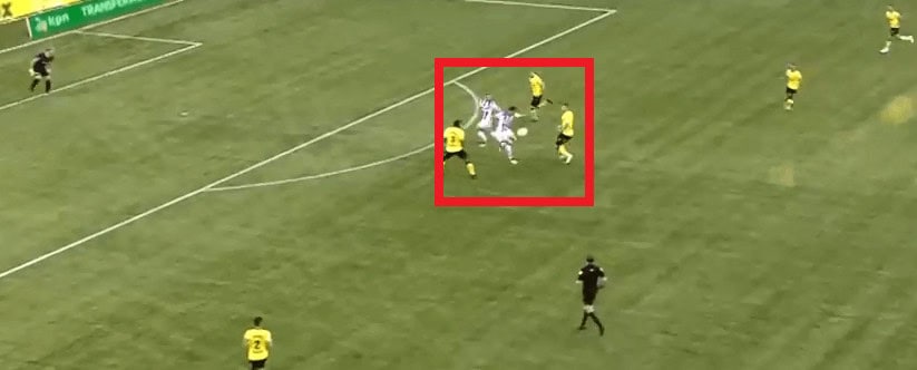 The above example shows another way of Lammers getting the ball in a tight space. He quickly and calmly creates a window to finish. He brilliantly cleans up a bad pass and with one quick settling touch creates a goal.