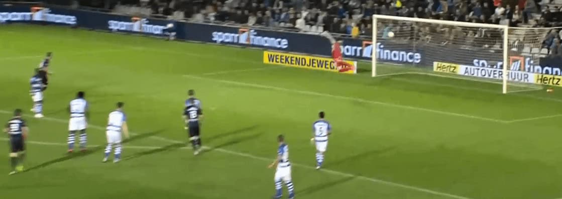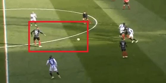Below is an example of Lammers ability to read the play and position himself off the ball to create a goal. Lammers is in an offside position on the left of the picture. The opponent central defender #6 is stepped up marking a teammate of Lammers.