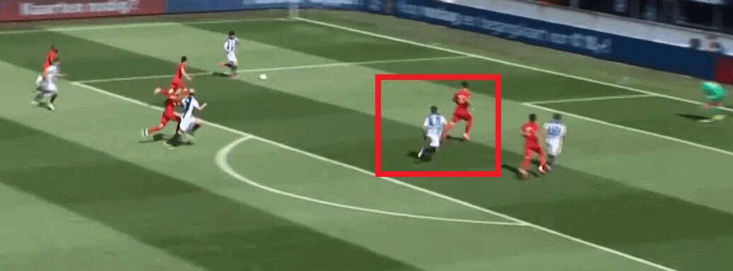 Here we see Lammers is targeted for a penetrating pass into his feet from his central defender.