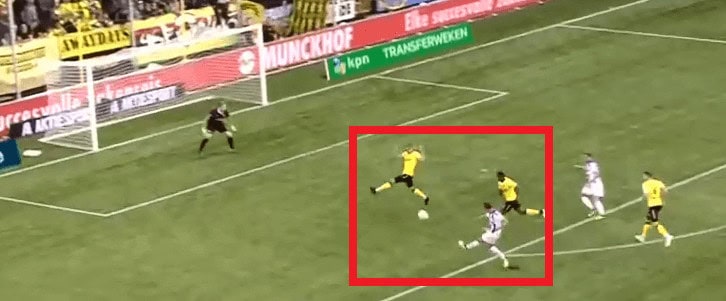 Dribbling into the box, the defender is “showing” Lammers towards his right foot. Lammers does two stepovers to off balance the defender.