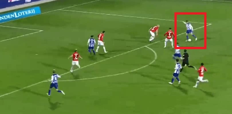 All of the above examples have shown Lammers on his favoured left foot. Lammers is equally adept at finishing with his right foot. It is truly a situation where he has no “weaker” foot. Look at this example with Lammers driving the ball down the right flank on a counter opportunity.