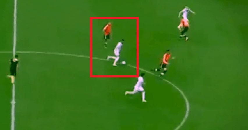 Lammers drives to his right off balancing the defence. Below we see the defence collapsing on Lammers with five defenders. Three of the defenders end up facing their own goal with #2 in white getting completely turned around.