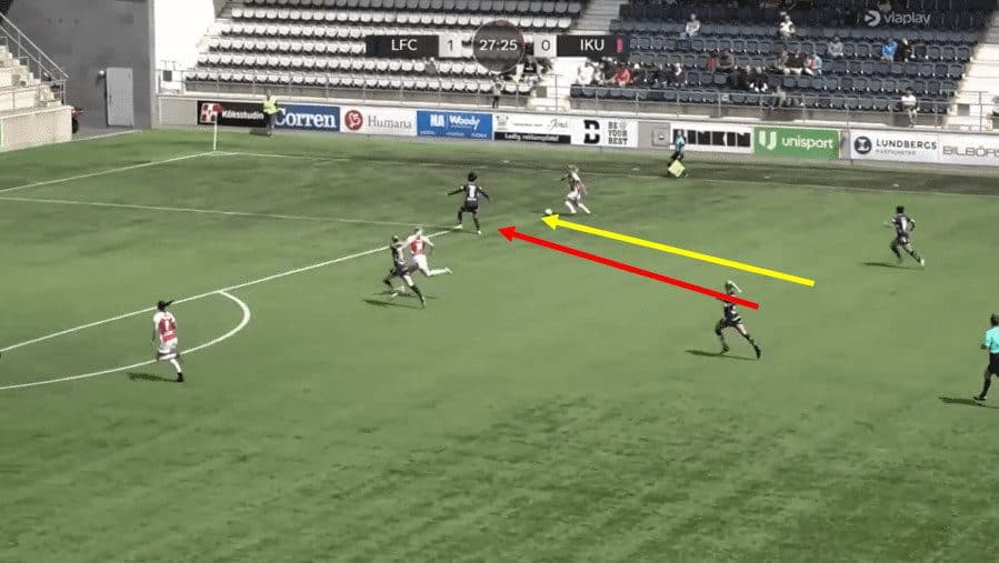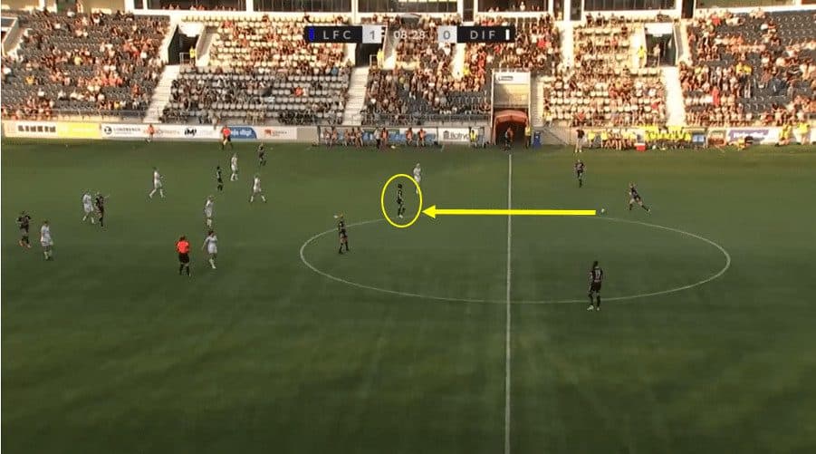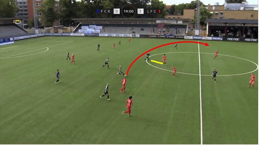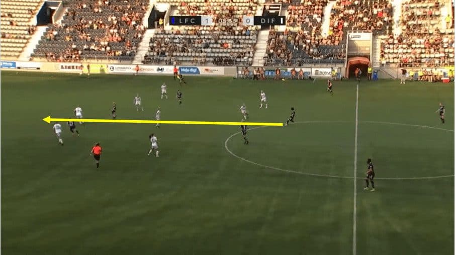In the above example, Linkoping wins the ball back in midfield. As soon as the ball is won back, Saori is looking to be in a position to receive the ball in space. She takes one quick look over her left shoulder onto the left side before the ball is played into her and then again as the ball is coming towards her. This allows her to make a quick decision on the ball by taking one touch with her left foot and then playing a dangerous through ball breaking for her teammate to run onto, breaking the defensive line in the meantime.