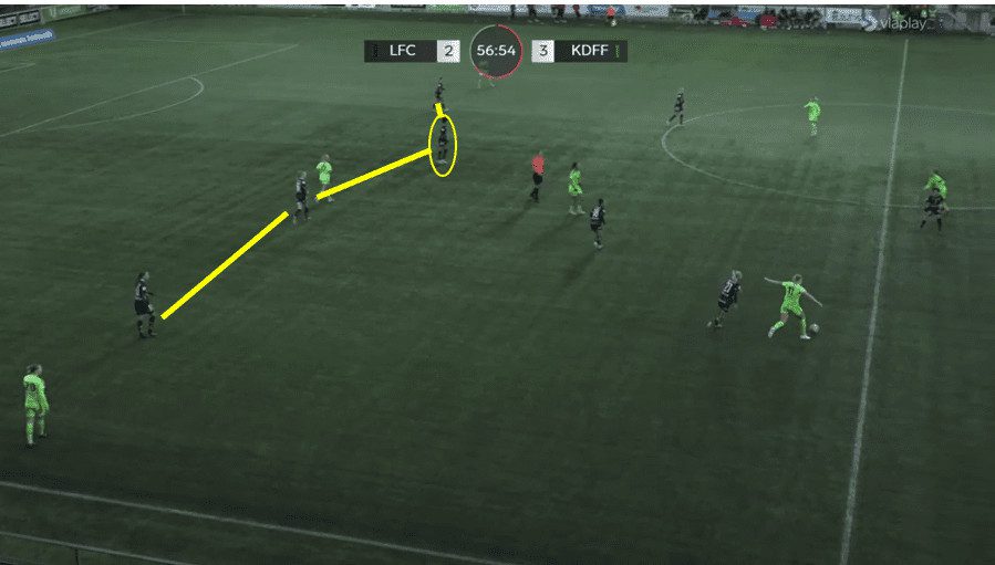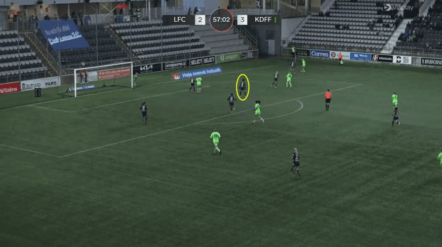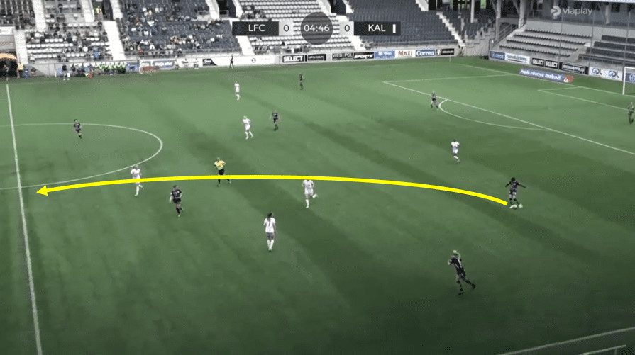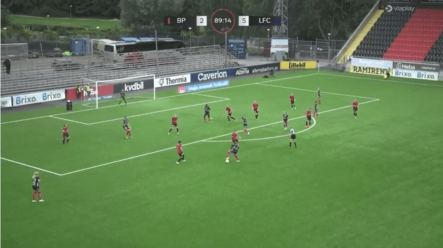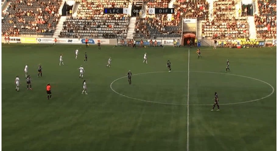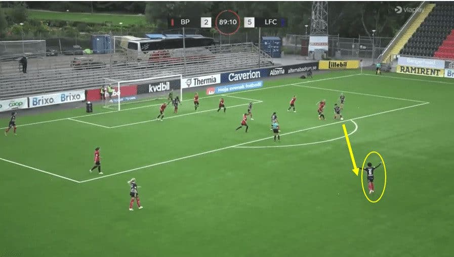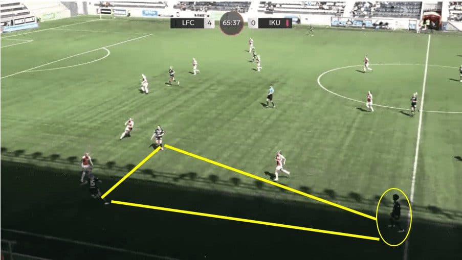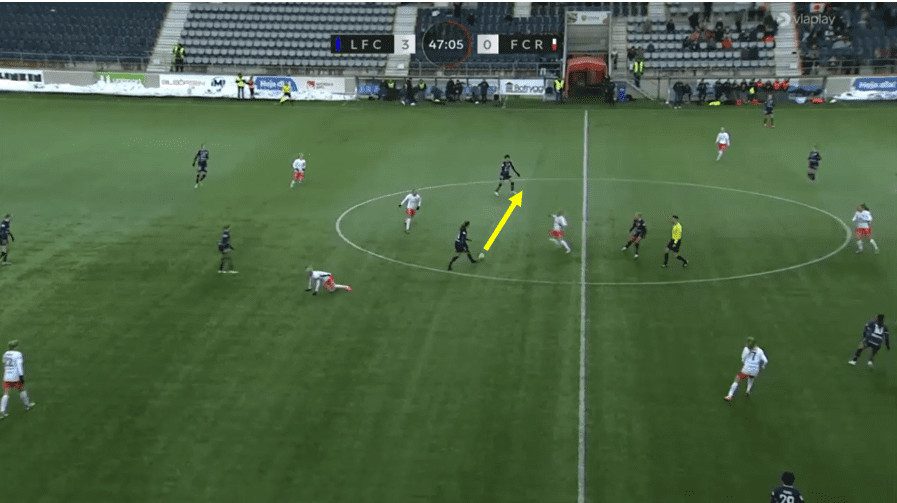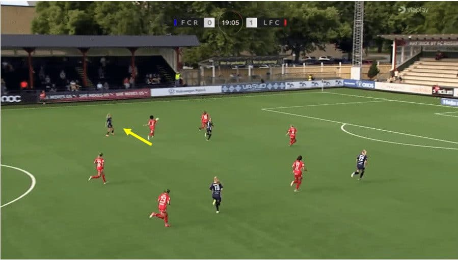 In this above example, Linkoping is sat back into their mid-block shape. You will notice that Saori’s start position is within the back line, actually playing in the most advanced position within that back line. It is interesting to note that the left-back is playing deeper than the rest of the back line as this keeps the winger on side and enables the midfielder to play a huge diagonal switch over the top of the defence. Then, as the ball is played out wide, Saori covers the ground well and can pick up a good position towards the edge of the box, alerting any cutback ball from the opposition. She constantly scanned over both shoulders to see if there were any threats around her.