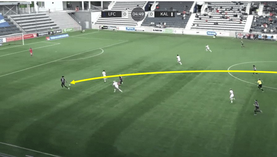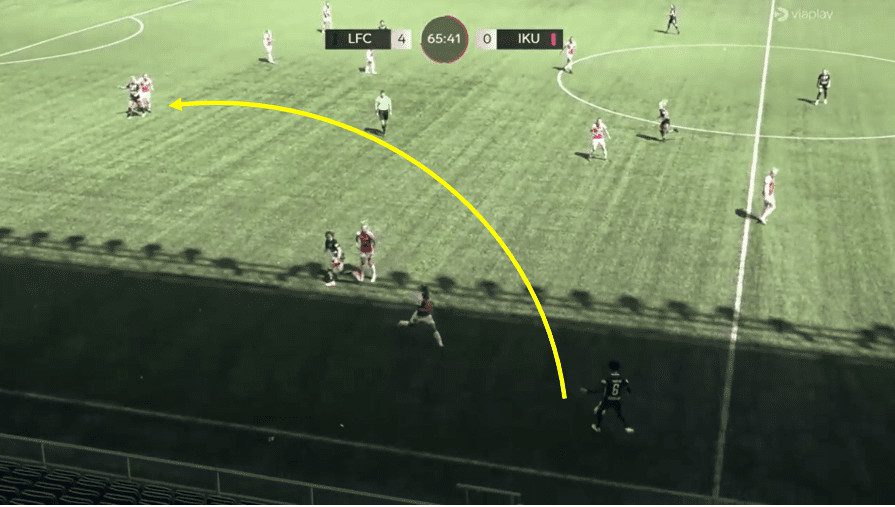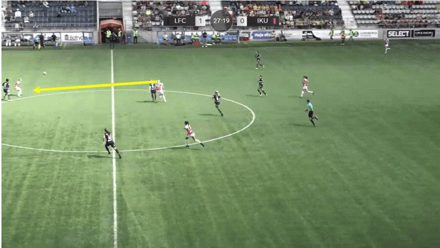 In this example, Saori is playing as a left-sided central defender instead of a central midfielder. She receives the ball from her goalkeeper, who rolls it out to her during the build-up. Saori opens up her body with her first two touches, gets the ball out of her feet onto her left foot and unleashes a fantastically struck left-footed, with her supposed weak foot, long ball for teammate Nellie Karlsson to run onto and get in behind the opposition defence. This example really demonstrates the quality Saori has to progress the ball with either foot from deep in central defence.