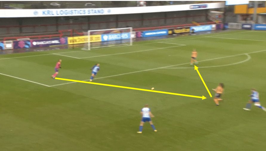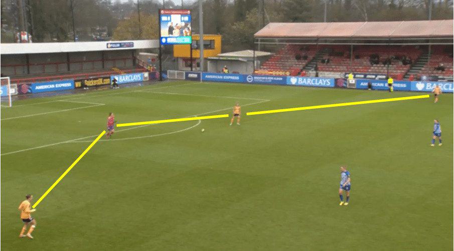 Now, both these examples give us an idea of how Saori could be utilised. As a central defender, she could either play as the left or possibly best suited to playing as the right centre-back, where she can play penetrating forward passes to progress Leicester in possession. Alternatively, as a central midfielder with her ability to scan regularly and make quick decisions, this could enable Leicester to have a strong link between defence and midfield as she is able to turn and play forward balls from there instead.