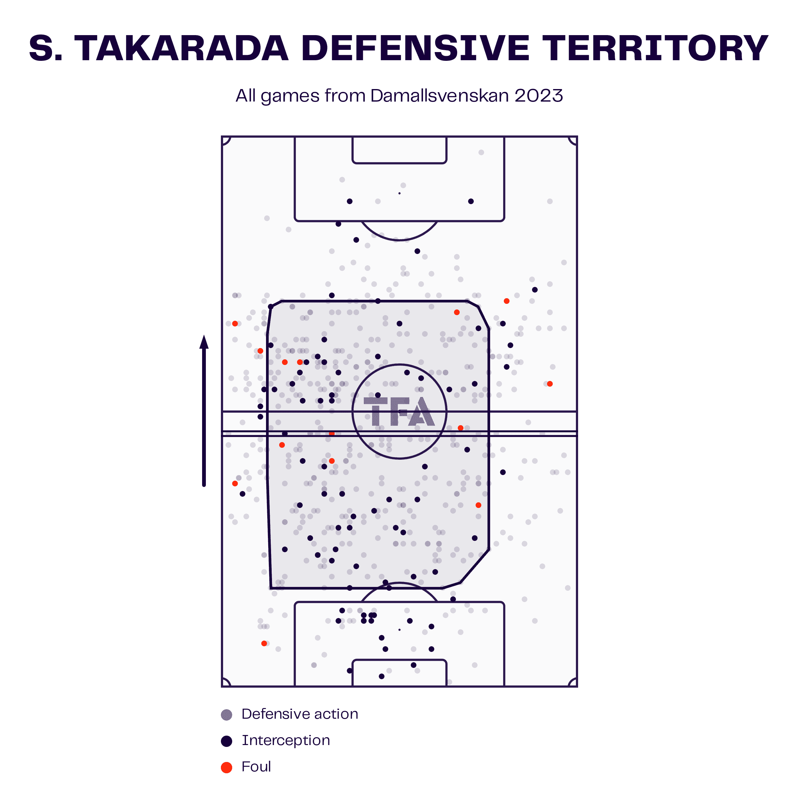 The diagram above shows how Saori can win the ball back across the field. Two things to notice from the diagram are the fact that her defensive territory is slightly lopsided towards the left side; this is due to her playing a significant amount of time as a left-sided central midfielder, in a midfield two or a left-sided centre back in a back three for Linkoping’s side. The other thing to note is that the territory is not high and extends deep towards her own box. This is important as it shows that her primary role is not to get high and tight to opponents in a high-pressing system but instead to sit back and screen the backline for most of the time.