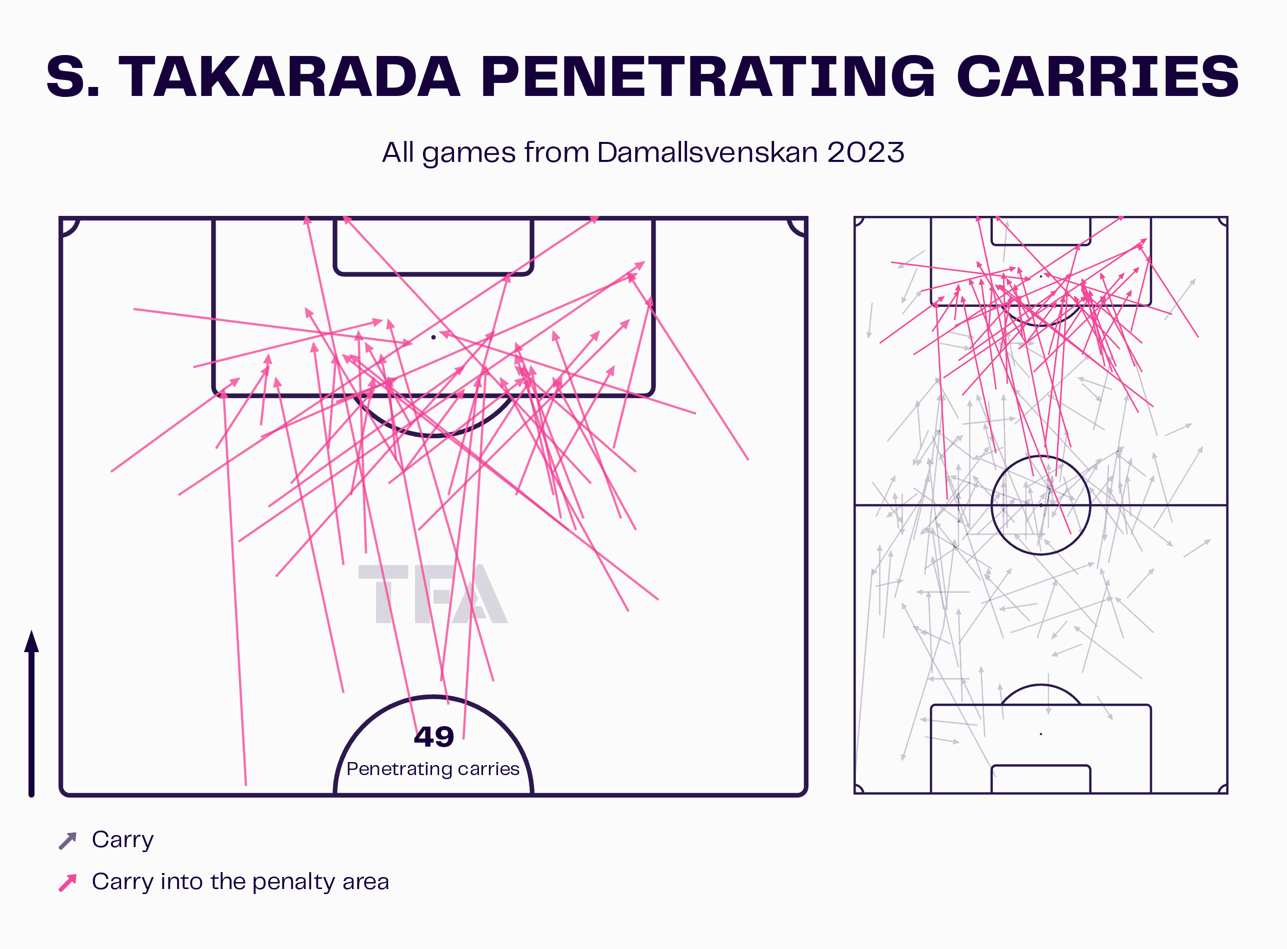 A further area that Saori could develop is her confidence to drive forward on the ball. This would get her into more dangerous positions where she could create goalscoring chances for her teammates. As this diagram above shows, she has the quality to make penetrating carries, with her making 49 into the penalty area throughout the 2023 campaign; however, this means she is averaging 1.8 per game. Considering how much she gets off the ball for the Linkoping side, this number could be higher and would enable her to create different angles, which in turn creates more passing lanes for her to progress the ball and create.
