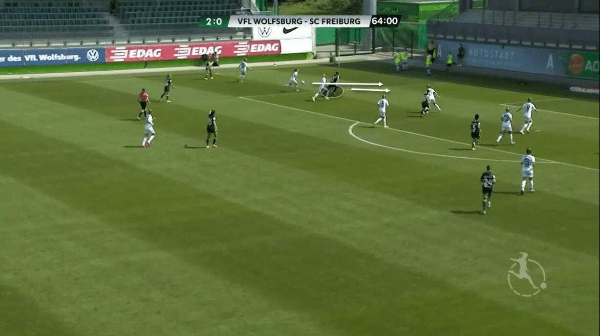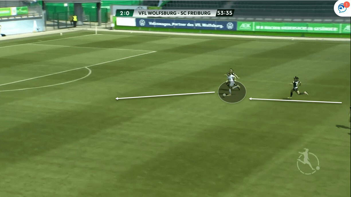 We can see an example of this in the game against Freiburg in the Frauen-Bundesliga. Gunnarsdottir is positioned high and once the ball is passed out wide she starts stepping away from the two opposing players. At this point, she already knows she wants to attack the vacant space.