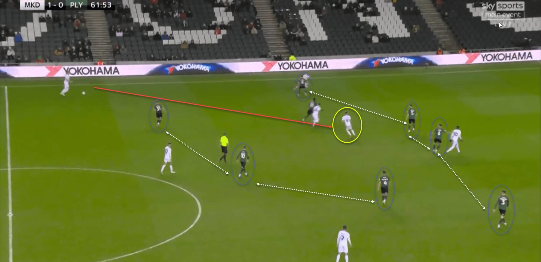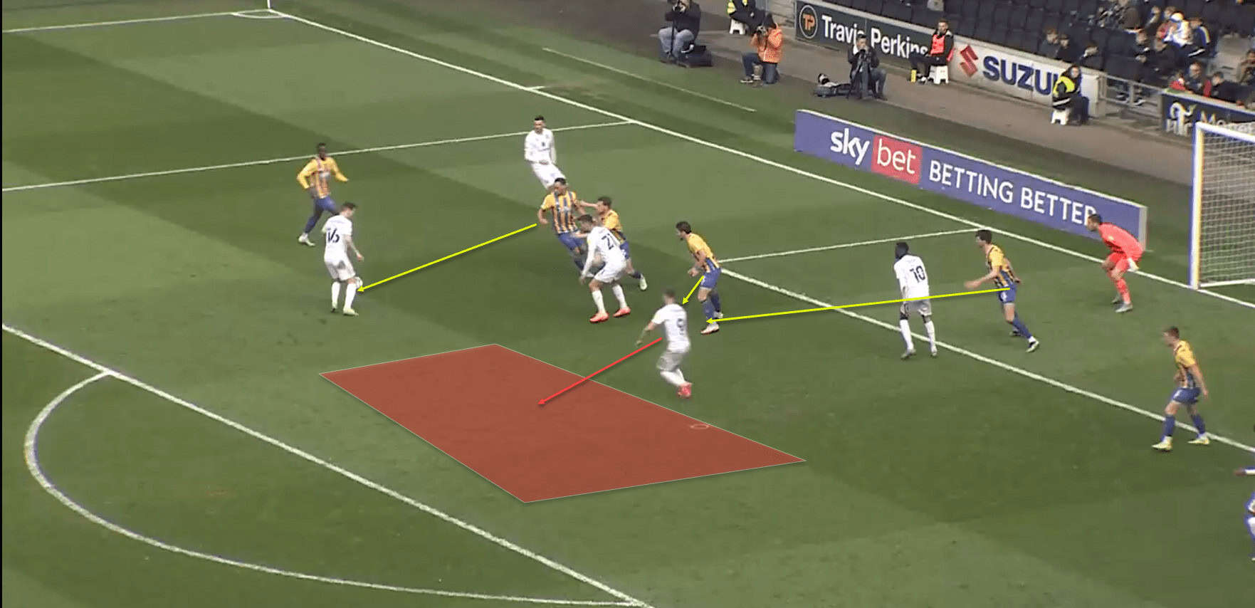 Hopefully, both of these examples show how Twine uses the space between defensive lines and his role in the MK Dons’ build-up play.
