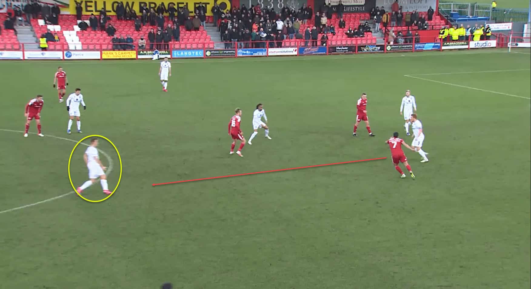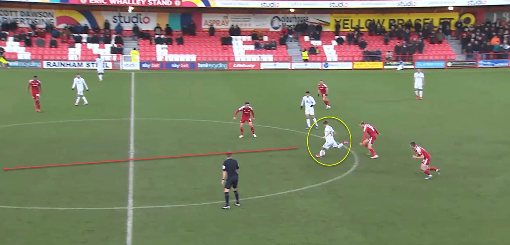This first example comes against Accrington Stanley, and as you can see, Twine is dropping into his own half to get on the ball.