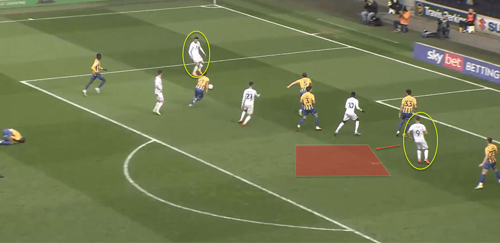 Now Twine doesn’t wait for the ball and with the Shrewsbury defenders pressing up, he decides to drop deeper into the highlighted space.