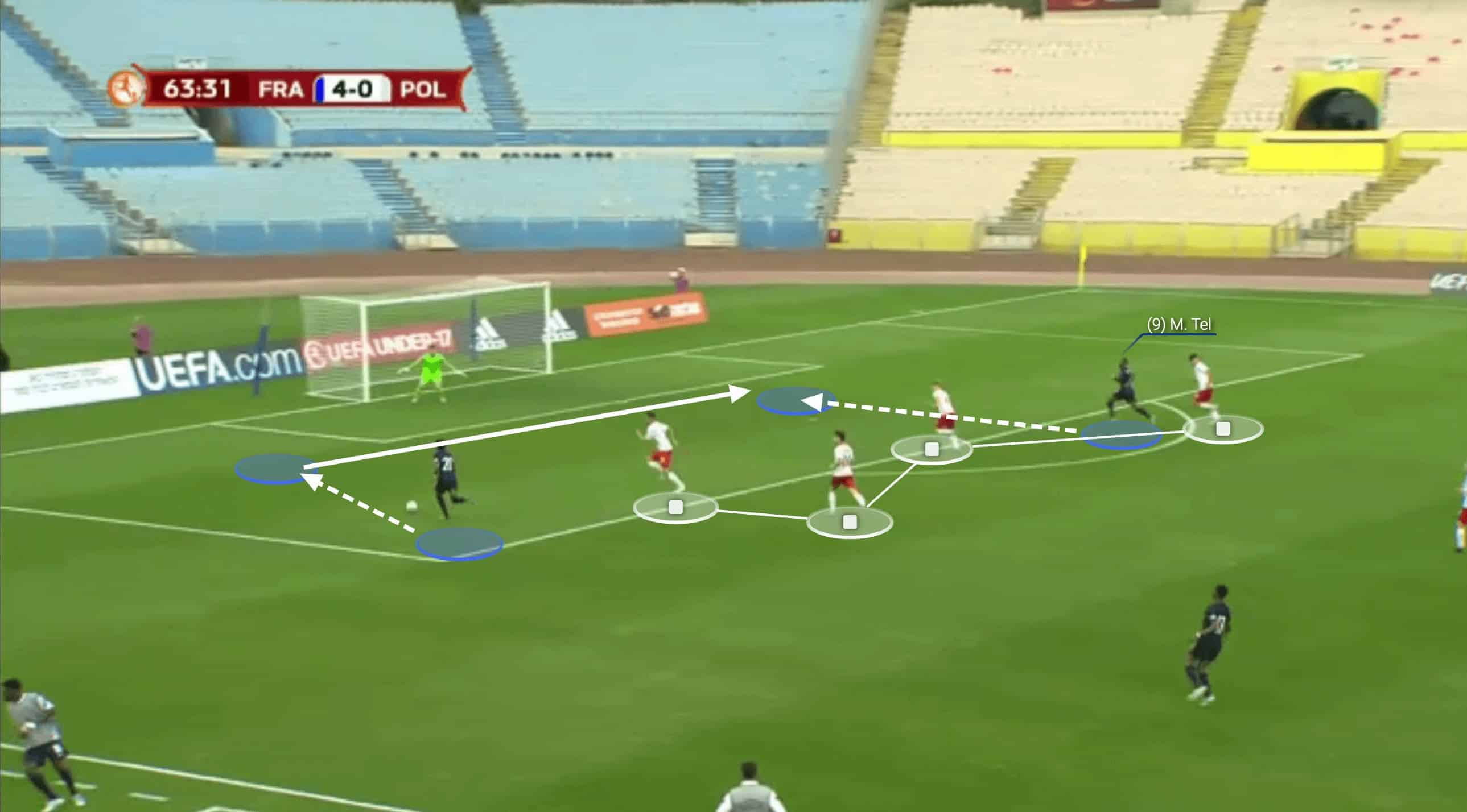 The Polish defensive line is looking to drop in to cover the threat, but on the far side of the pitch, Tel is breaking into the area on the blind side of the central defender.