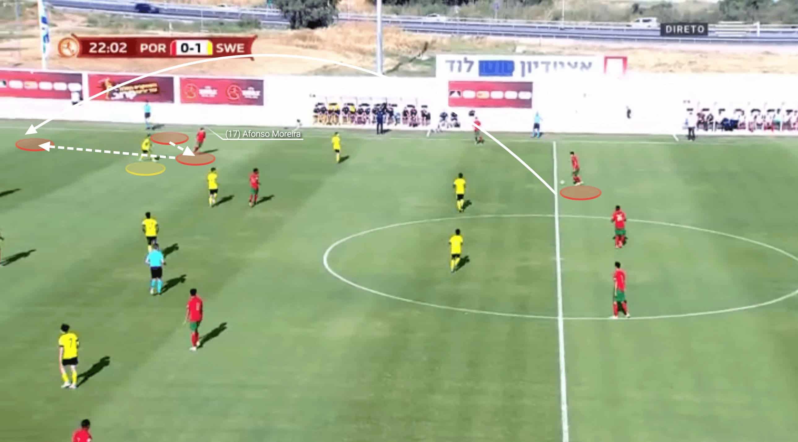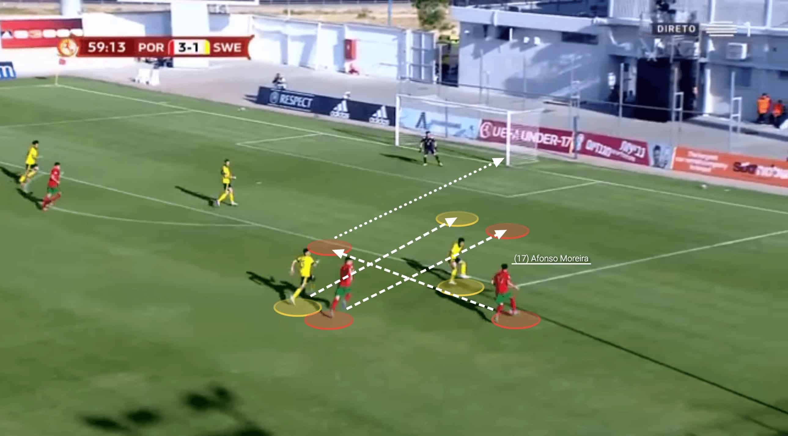 This simple movement drags the opposition defender forward, and Moreira spins and attacks the space behind the defensive line.