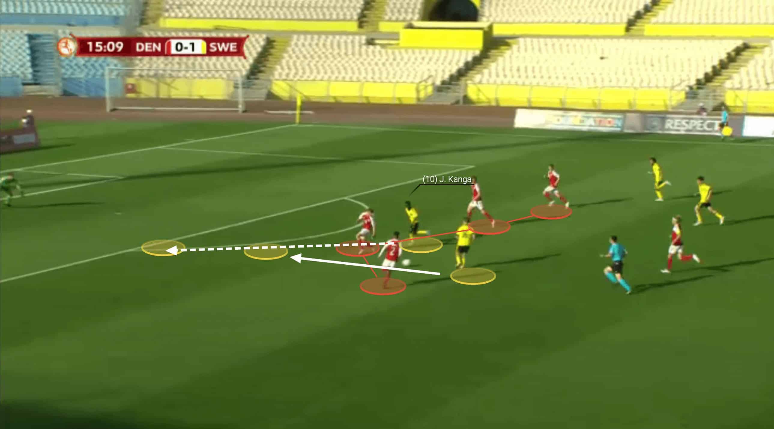 Here, as his teammate has time on the ball Kanga makes a dynamic diagonal run to break the last line.