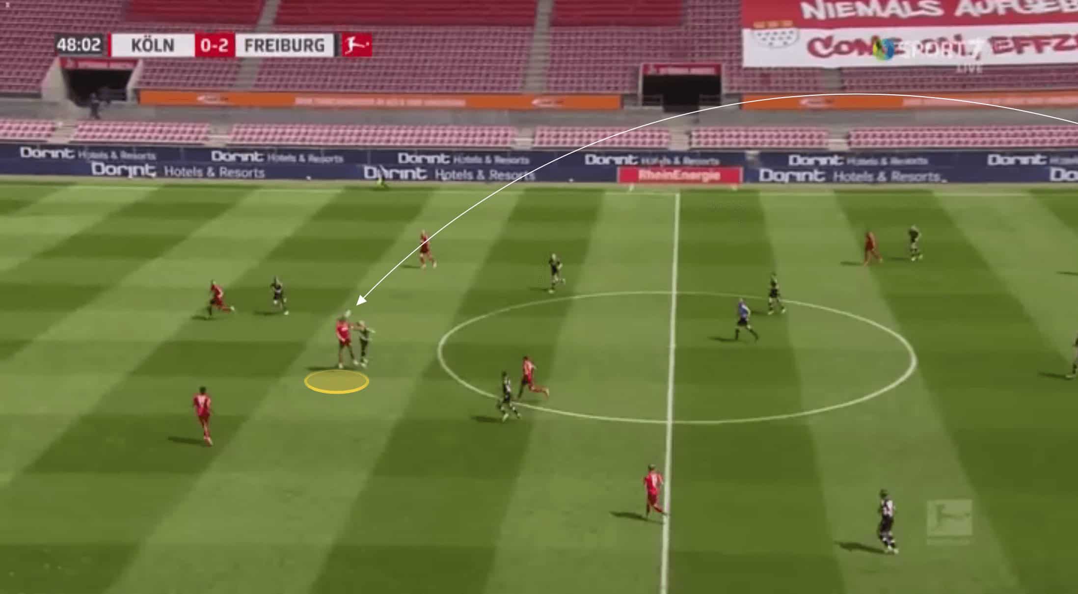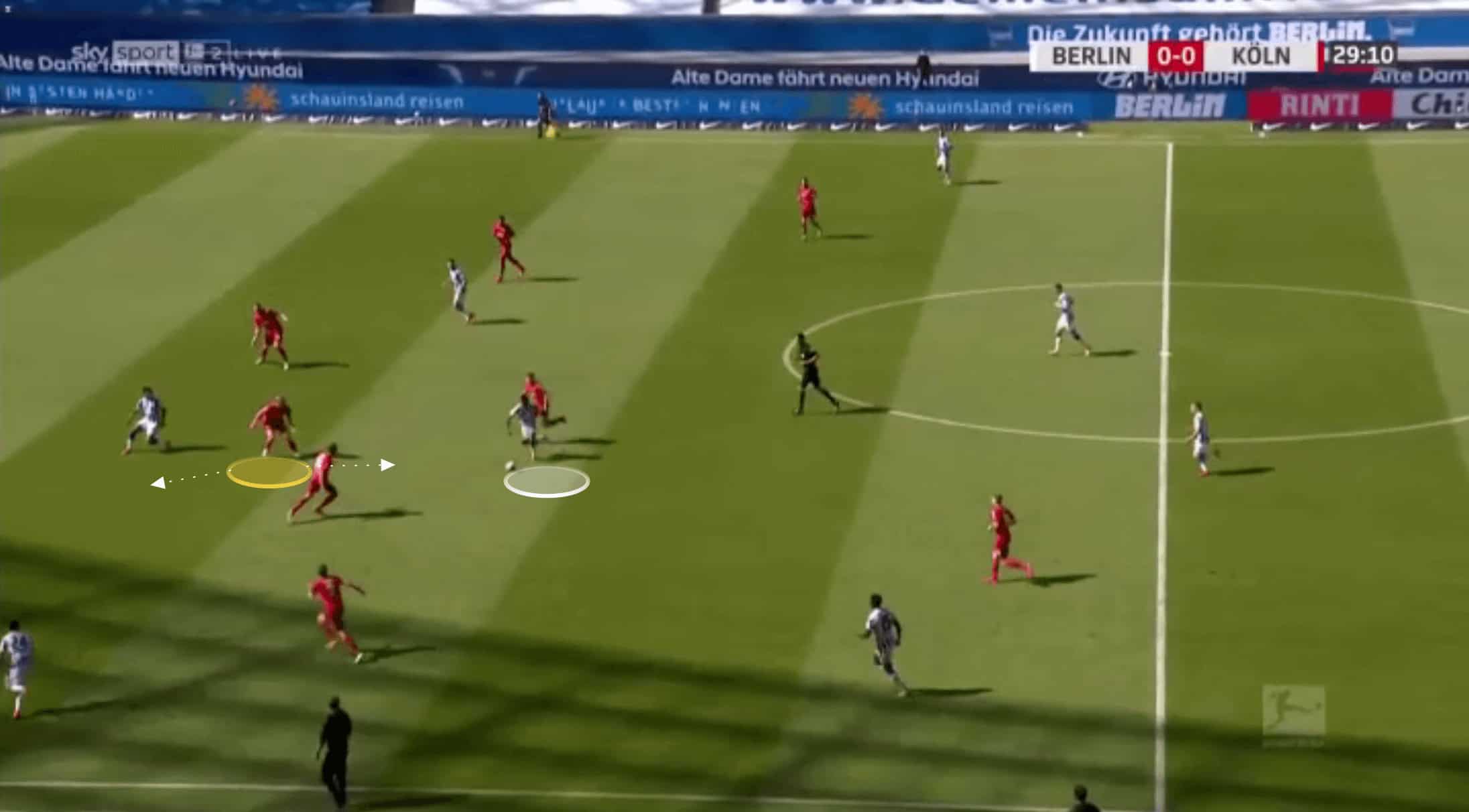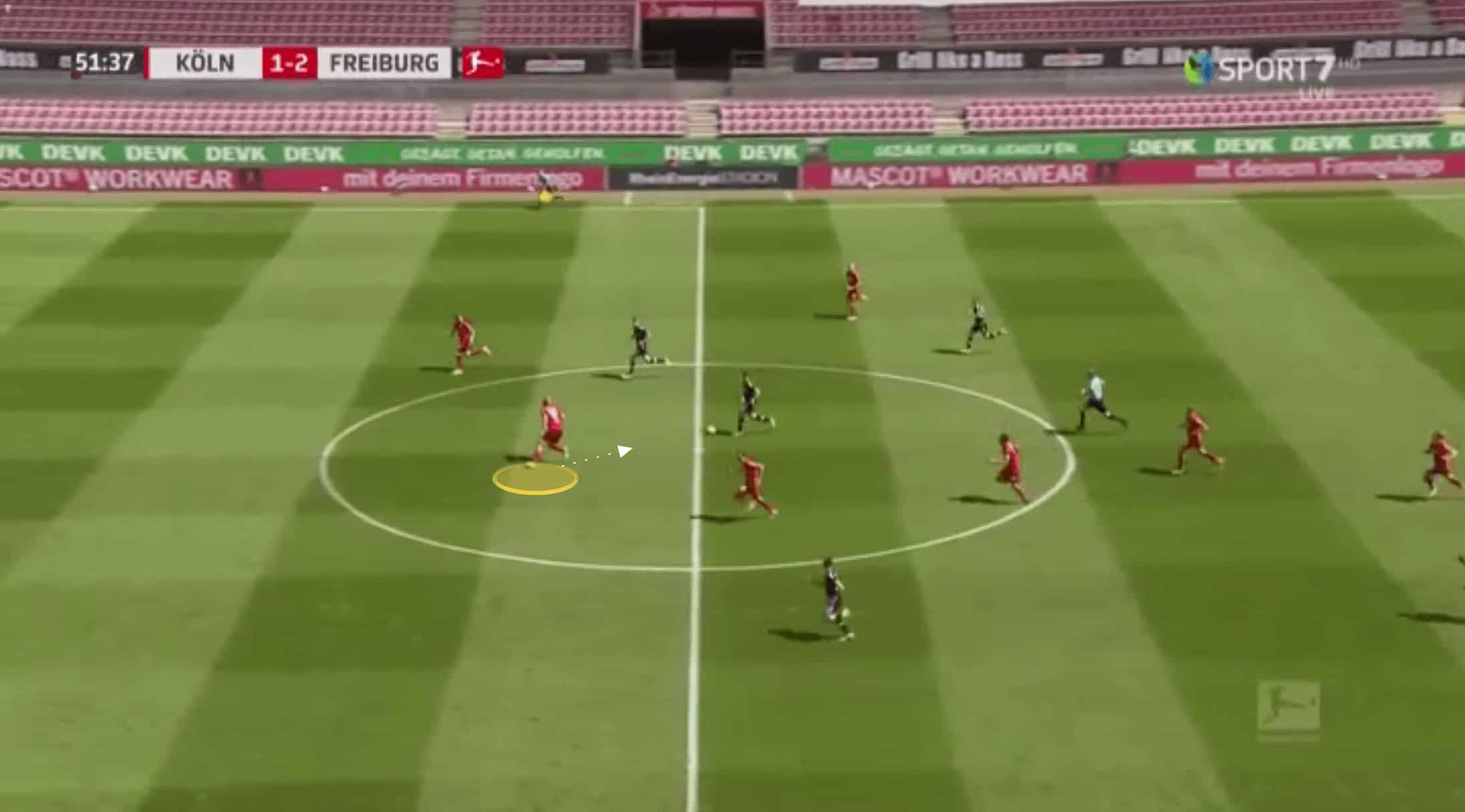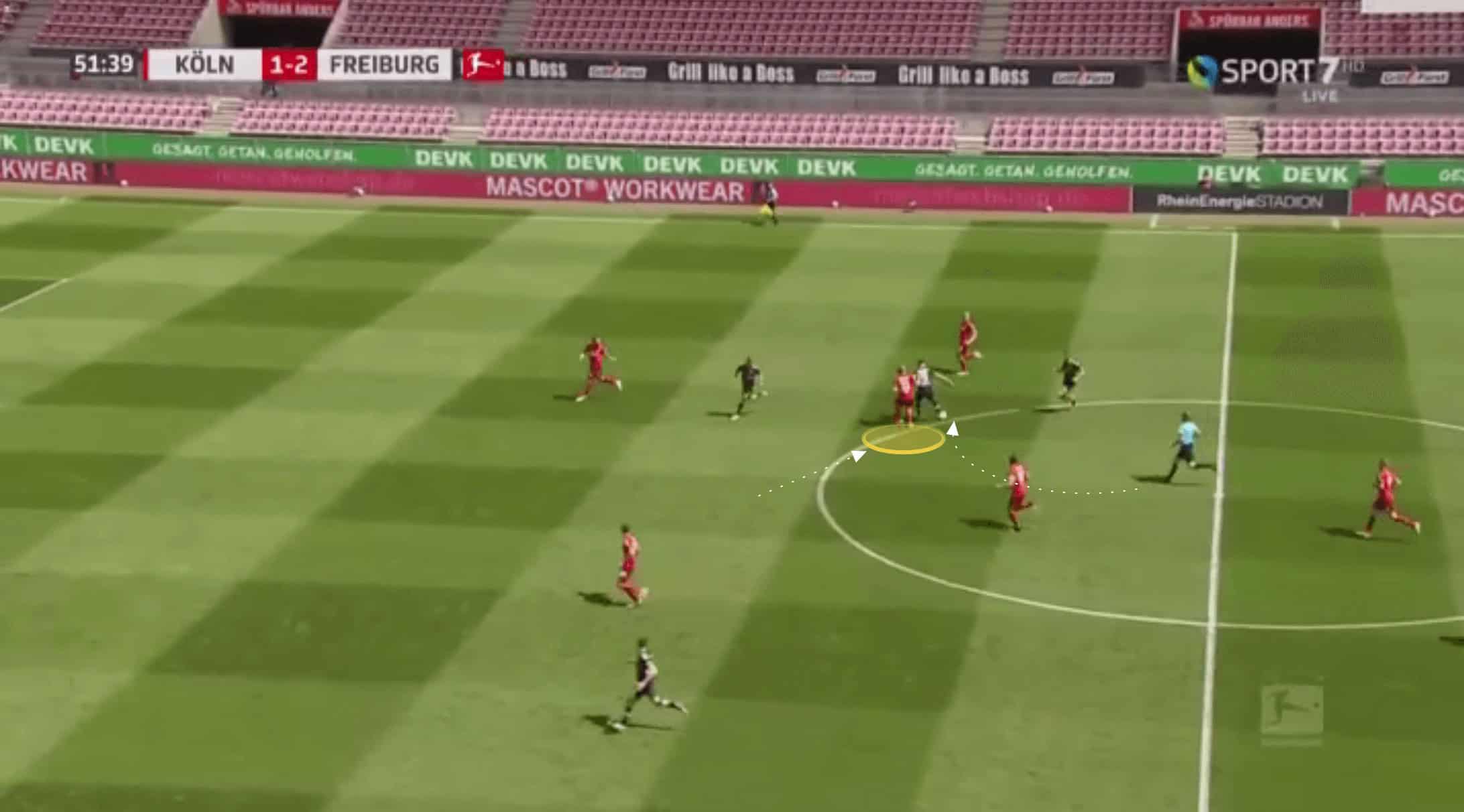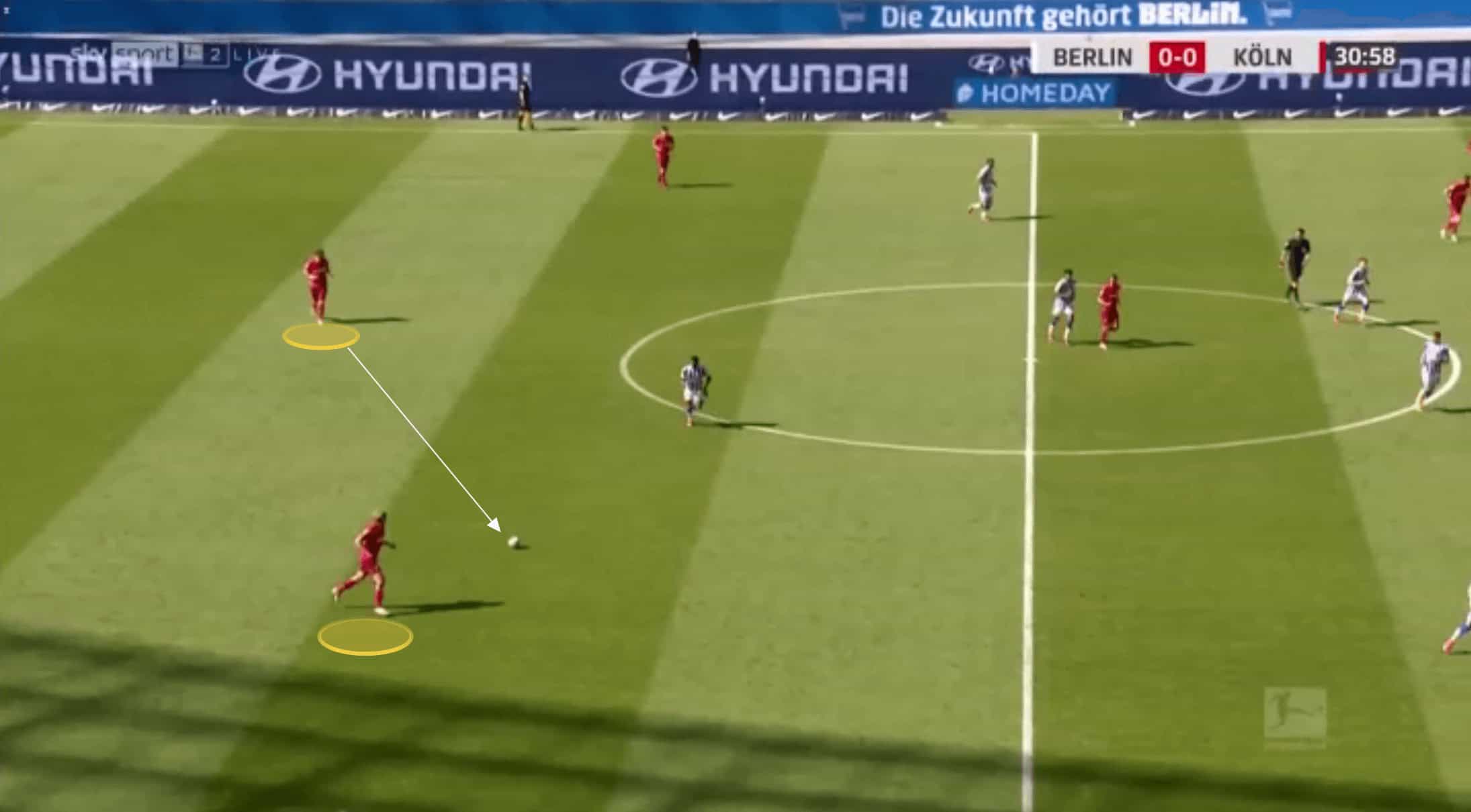Below, the pass is played through Koln’s midfield, and Bornauw is the closest goal-side defender.